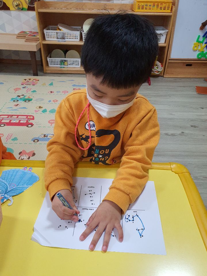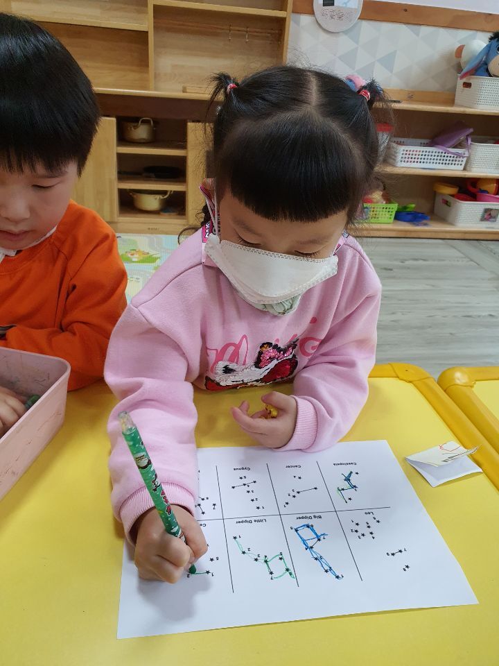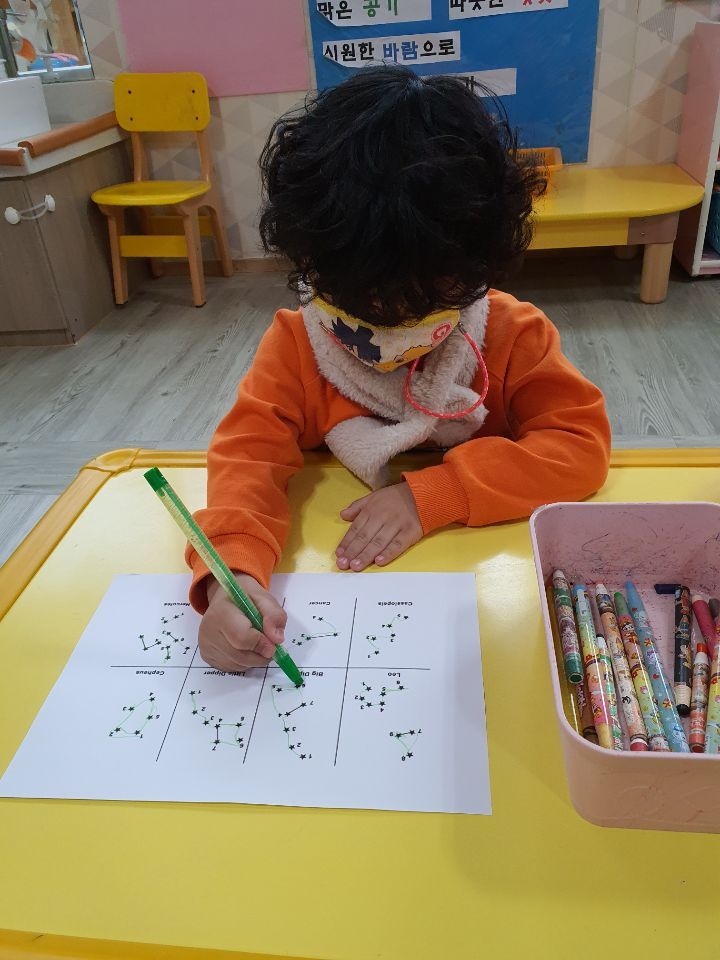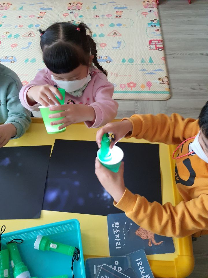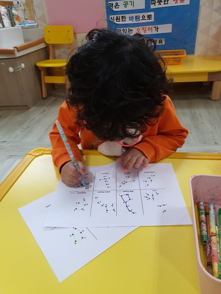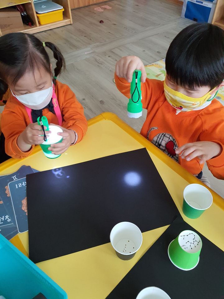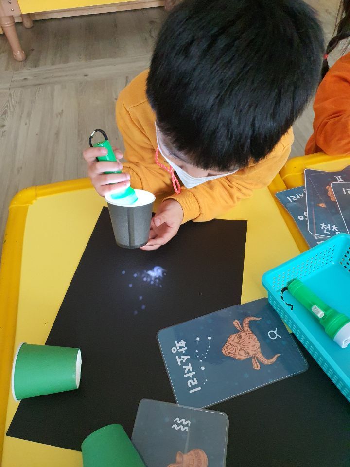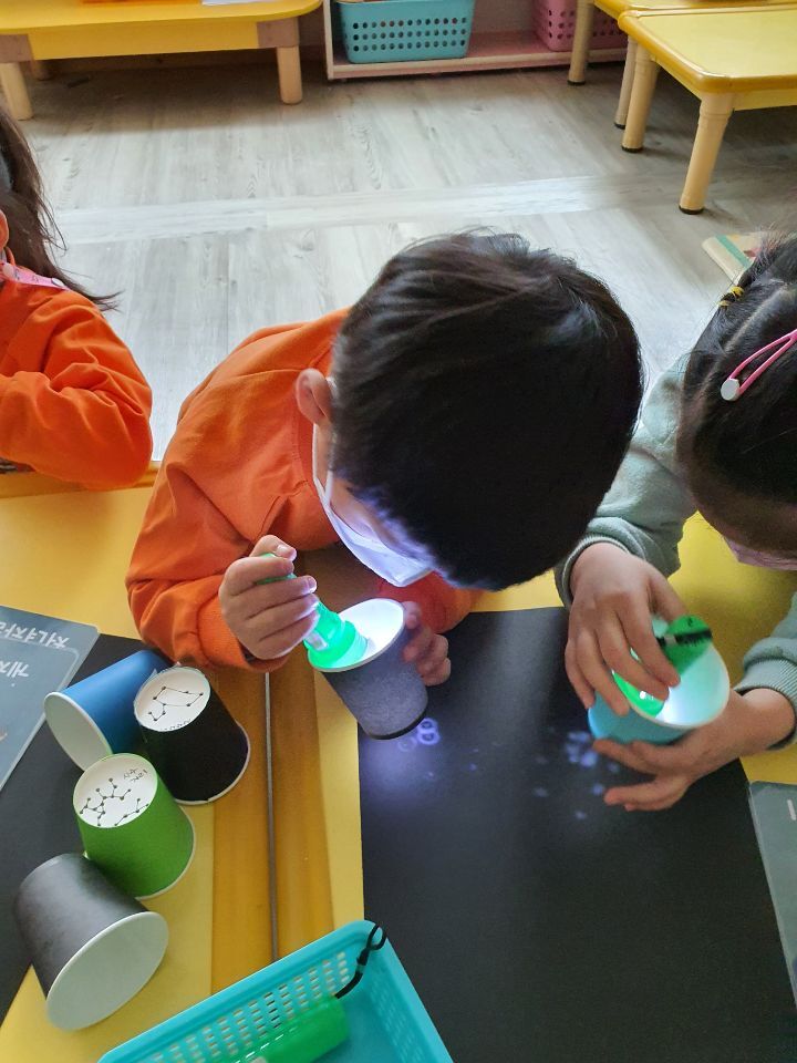 숫자 연결해서 별자리 그림 그려보기도 하고 손전등과 종이컵을 이용해 반짝반짝 자신의 별자리를 만들어 보기도 했어요~~