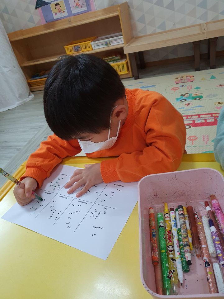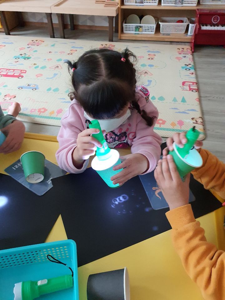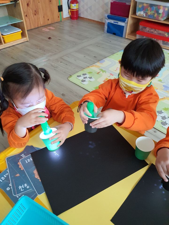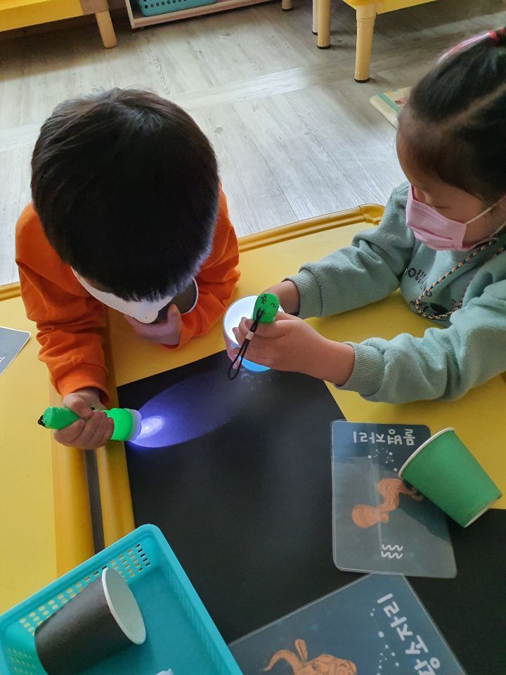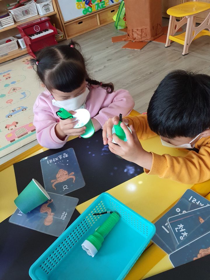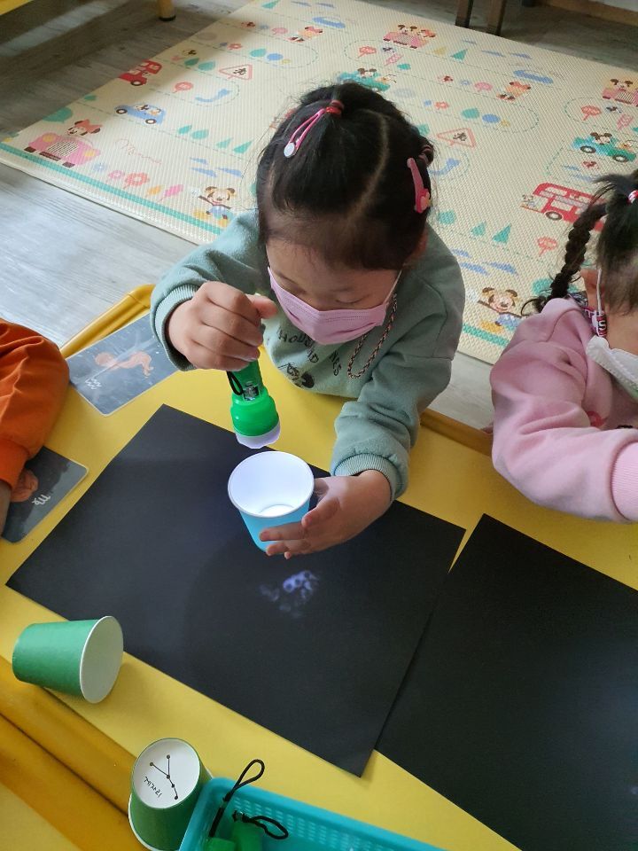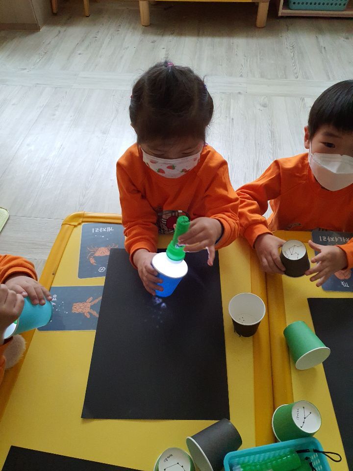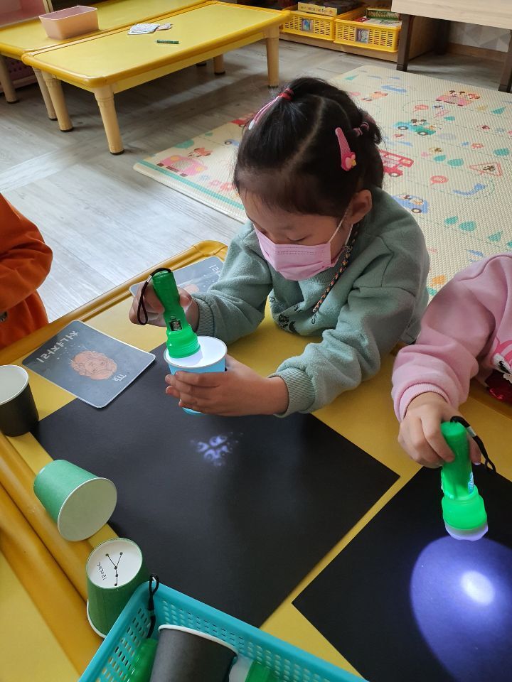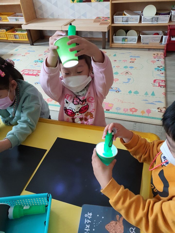 숫자 연결해서 별자리 그림 그려보기도 하고 손전등과 종이컵을 이용해 반짝반짝 자신의 별자리를 만들어 보기도 했어요~~