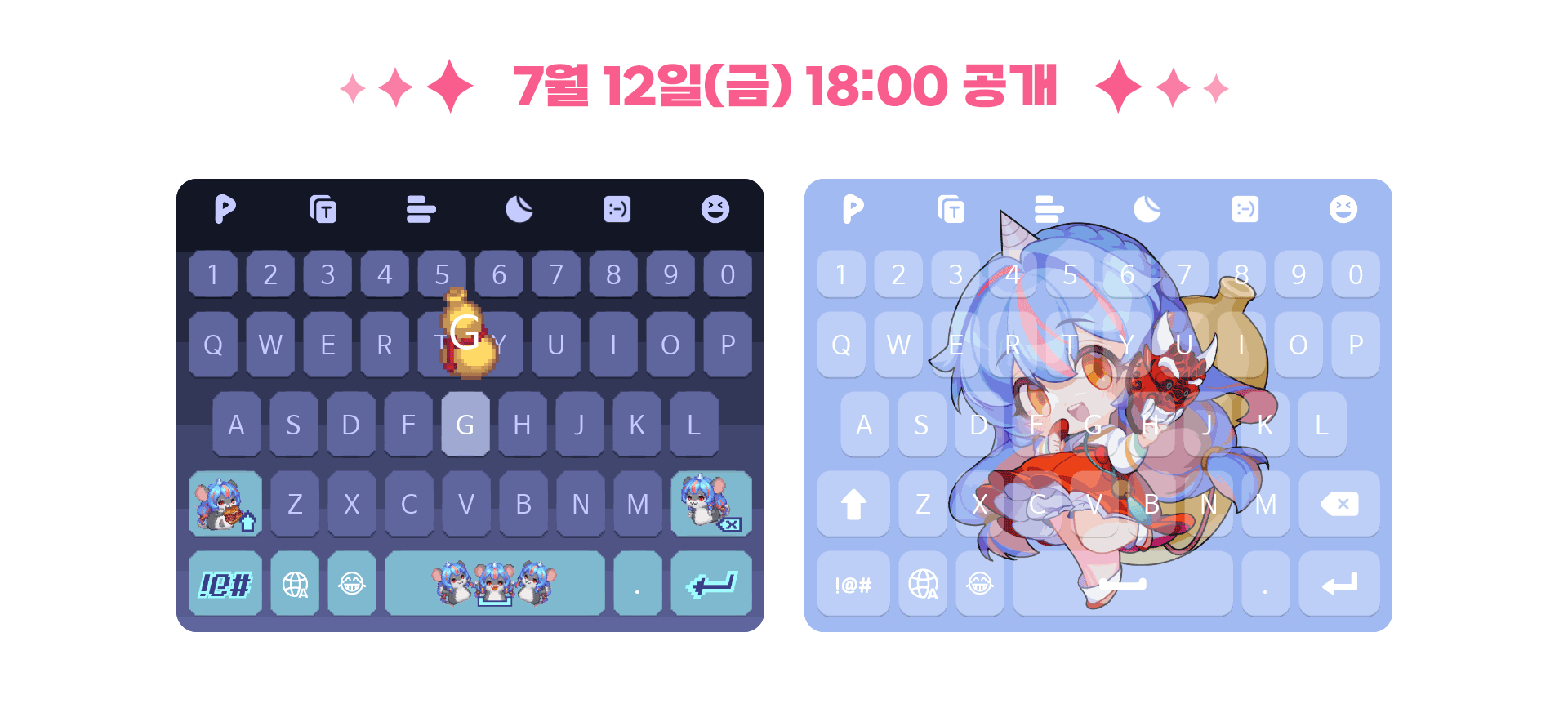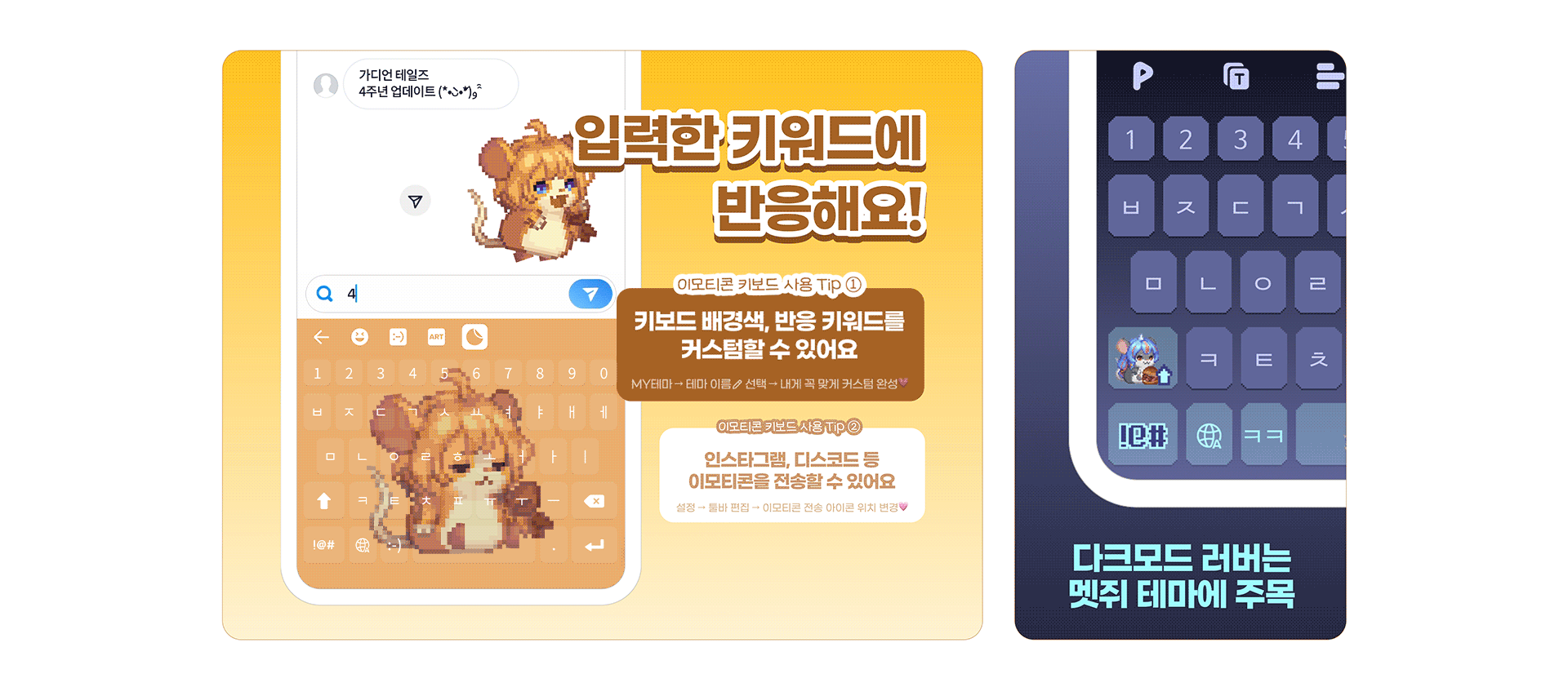 ※ 이모티콘 테마 적용 시 특정 키워드를 입력하면 키워드에 따라 키보드 테마 영웅의 모션이 변경됩니다.