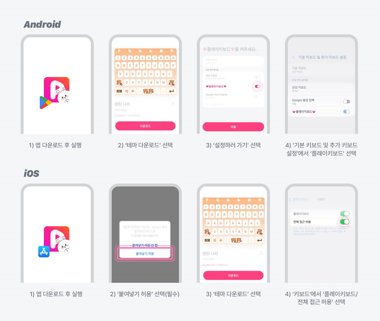 - 테마 적용 과정에서 어려움을 겪으시면, 플레이키보드 앱 → 설정 → 고객센터로 문의해 주시기 바랍니다.