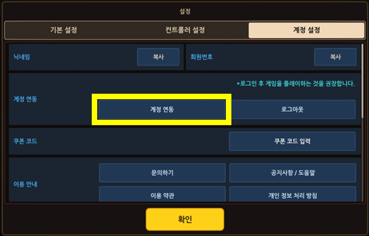 1. 게임 화면 상단의 설정(톱니바퀴) 터치 → 계정 설정