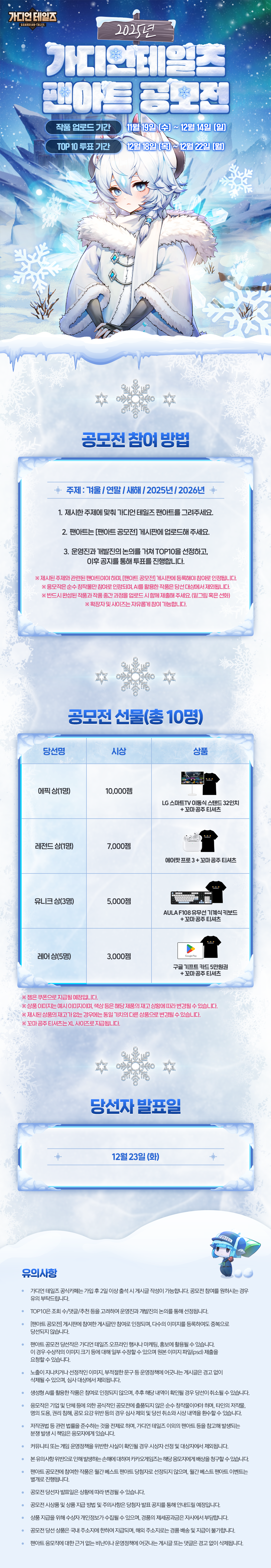 2025년 가디언 테일즈 팬아트 공모전 (~12/14) 작성자정중한 기사|작성시간25.11.19|조회수4,854 목록 댓글 9 글자크기 작게가 글자크기 크게가 다음검색 현재 게시글 추가 기능 열기 북마크 공유하기 신고 센터로 신고 댓글 댓글 9 댓글쓰기 답글쓰기 댓글 리스트 작성자구아르디안 탈레스 | 작성시간 25.11.19 [정보] - 2025년 : 을사년, 푸른 뱀의 해 - 2026년 : 병오년, 붉은 말의 해 작성자하얀사신 | 작성시간 25.11.19 작성자뉴 비 | 작성시간 25.11.19 이쁜 그림들 기대하고 있습니다! 금손 기사님들의 작품 감사히 감상하겠습니다! 작성자메이릴최고 | 작성시간 25.11.19 작성자플루오린 | 작성시간 25.11.20 댓글 전체보기