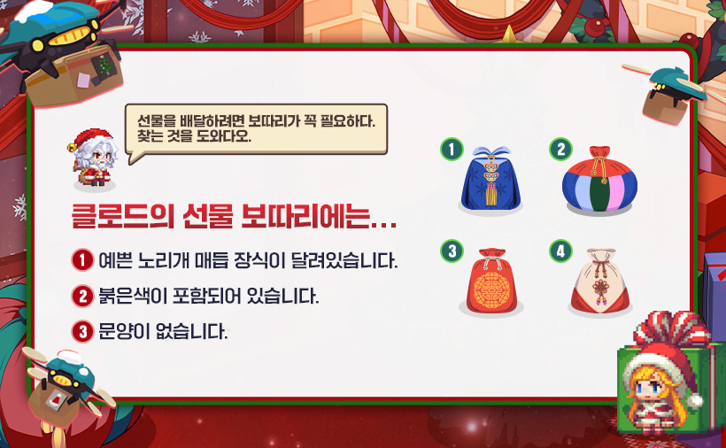 - 아래의 이미지를 보고 클로드가 잃어버린 선물 보따리는 어떤 것인지 정답을 맞혀 주세요.