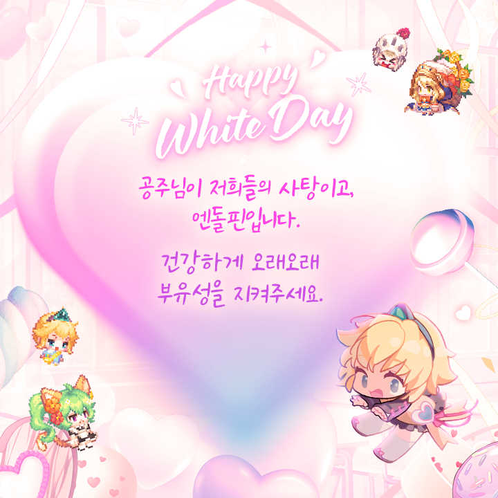 | 고니빠 | 공주님, 언제나 함께 모험을 떠나서 즐겁습니다. 화이트 데이 때, 사탕 너무 많이 드시지 마시고 재밌게 뛰어노셨으면 여한이 없겠습니다. 앞으로도 잘 부탁드립니다. |