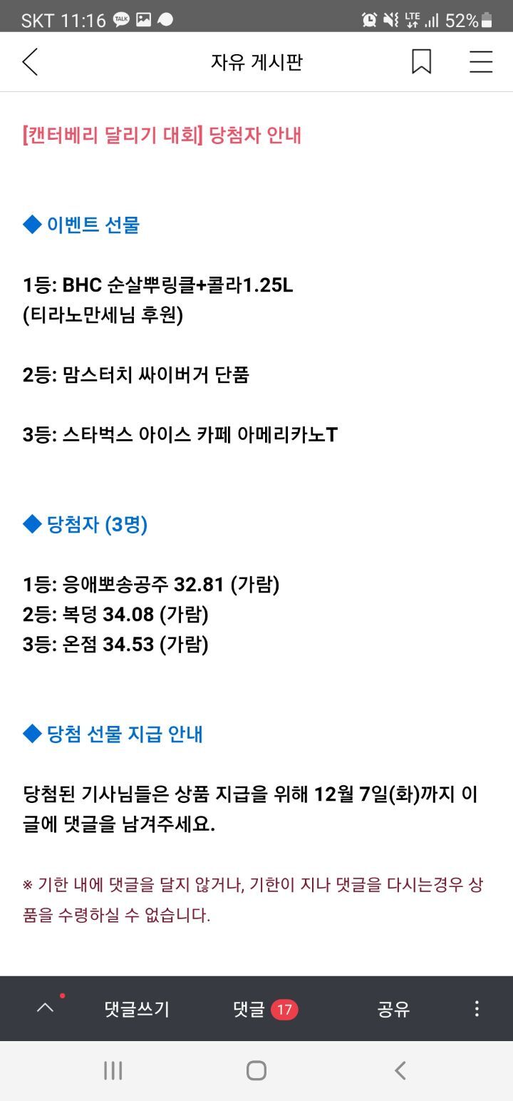 달리기 1등! 작성자응애뽀송공주|작성시간21.12.02|조회수175 목록 댓글 27 글자크기 작게가 글자크기 크게가 티라노만세님, 메로님 잘먹겠습니다! 감사합니다! ㅠㅠ 다음검색 현재 게시글 추가 기능 열기 북마크 공유하기 신고 센터로 신고 댓글 댓글 27 댓글쓰기 답글쓰기 댓글 리스트 답댓글 작성자응애뽀송공주 작성자 본인 여부 작성자 | 작성시간 21.12.03 감사합니다 ㅠㅠ 작성자메로° | 작성시간 21.12.03 답댓글 작성자응애뽀송공주 작성자 본인 여부 작성자 | 작성시간 21.12.03 잘먹었습니다! 작성자타이밍 | 작성시간 21.12.03 승자의 치킨 ! 답댓글 작성자응애뽀송공주 작성자 본인 여부 작성자 | 작성시간 21.12.03 이렇게 하루끼니를 때웠습니다 ㅠㅠ 댓글 전체보기