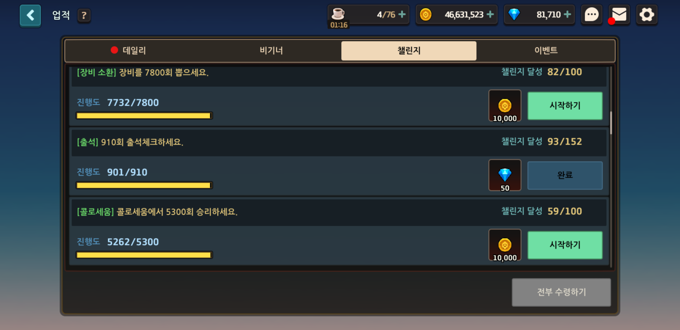 업적 하다가 스트레스 받으면서 게임하지 말아야지 싶어서 적당한 수준에서 멈췄습니다 지난 업적은 길드원이랑 동생이 해줬어요