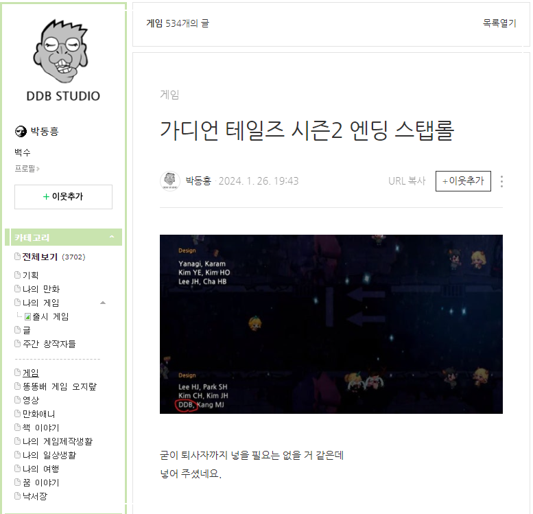 가디언테일즈 개발에 참여하셨던 똥똥배(박동흥)님의 안타까운 소식 전해드립니다. 작성자타이밍|작성시간24.08.19|조회수765 목록 댓글 2 글자크기 작게가 글자크기 크게가 기적이 있으면 좋겠습니다. '임금체불 시뮬레이션' 개발자 '똥똥배', 투병 중 '가망 없음' 선고 - 글로벌이코노믹인디 게임 개발자 겸 만화가로 이른바 '똥똥배'란 닉네임으로 활동하던 박동흥씨가 투병 중 병원으로부터 의식 회복의 가망이 없다는 판정을 받은 것으로 알려졌다.박동흥 씨 공식 블로그에 따www.g-enews.com 이런 가테 만화도 그려주셨네요. [가디언 테일즈] 추수감사절: 똥똥배 만화방누구나 수익을 창출할 수 있는 창작 콘텐츠 플랫폼www.postype.com 다음검색 현재 게시글 추가 기능 열기 북마크 공유하기 신고 센터로 신고 댓글 댓글 2 댓글쓰기 답글쓰기 댓글 리스트 작성자있스 | 작성시간 24.08.19 기적이 있기를! 작성자여캐뽑으러옴 | 작성시간 24.08.19 좋은 결과가 있으시길. 댓글 전체보기
