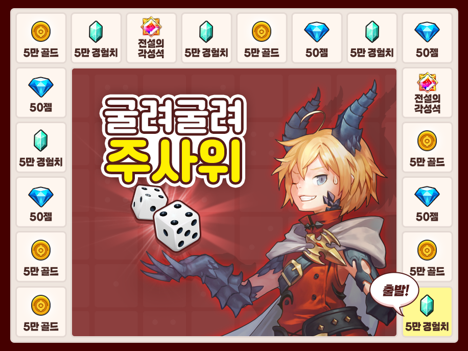 ※ 첫 번째 주사위가 1일 경우 받게 되는 아이템은 '5만 경험치' 입니다.