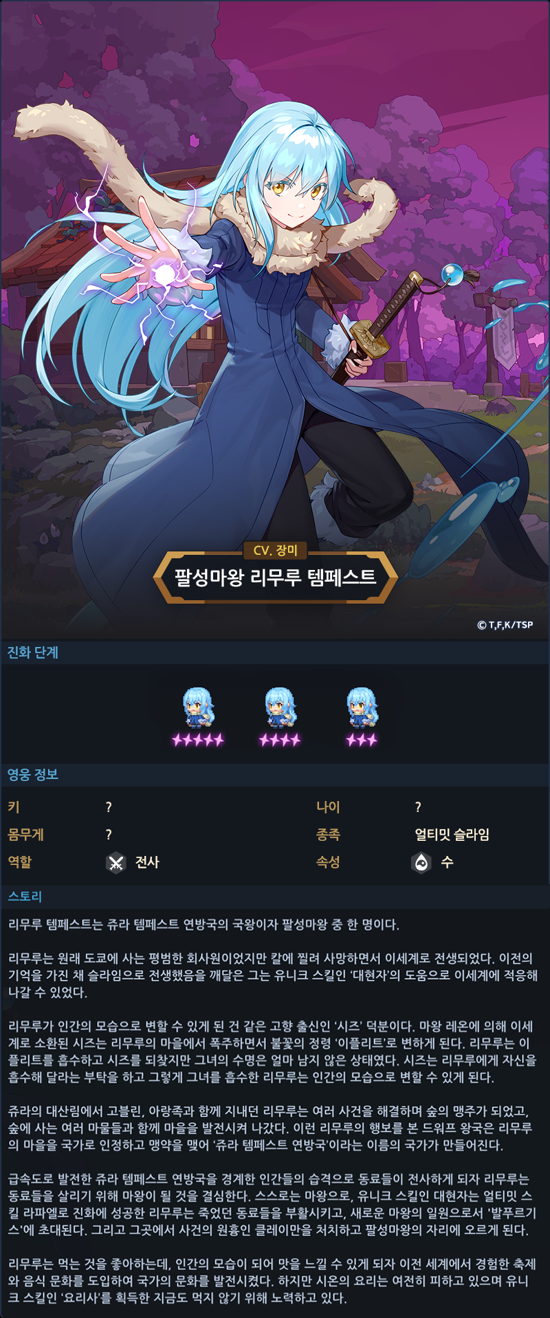 - 신규 영웅인 팔성마왕 리무루 템페스트가 추가되고 한국어 보이스가 함께 추가됩니다. (CV. 장미, 오카사키 미호)