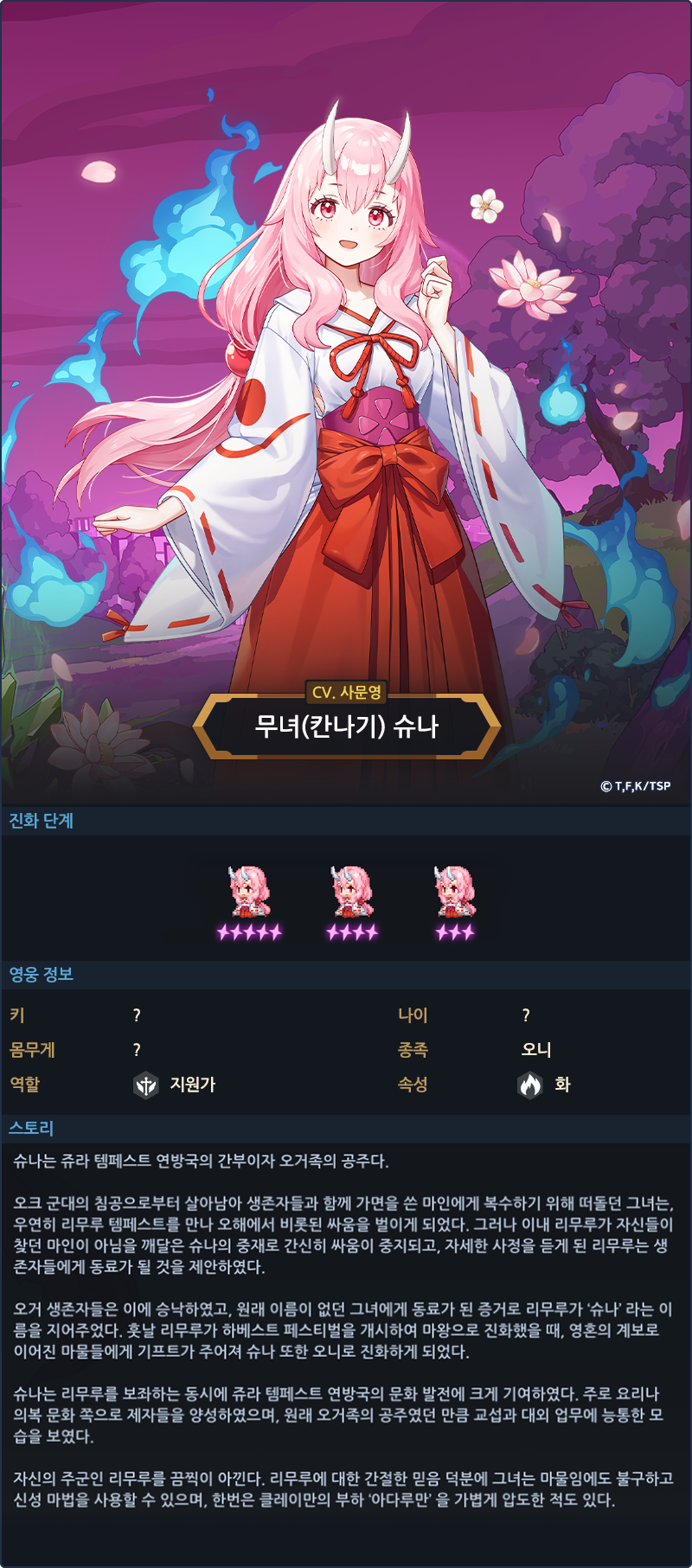 - 신규 영웅인 무녀(칸나기) 슈나가 추가되고 한국어 보이스가 함께 추가됩니다. (CV. 사문영, 센본기 사야카)