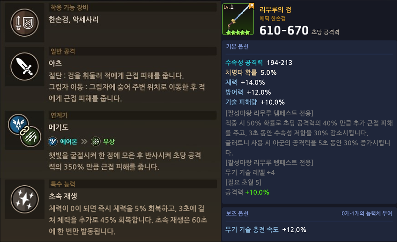 ㄴ 5성 최대 각성 시 파티 효과: [파티] 무기 기술 충전 속도 + 30% / 기술 피해량 + 30%