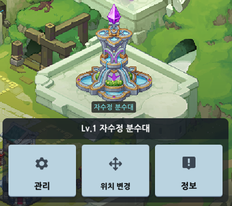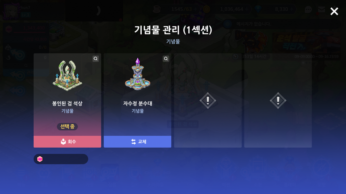 - 기념물 선택 시 확인할 수 있는 '회수' 버튼이 '관리'버튼으로 교체됩니다.