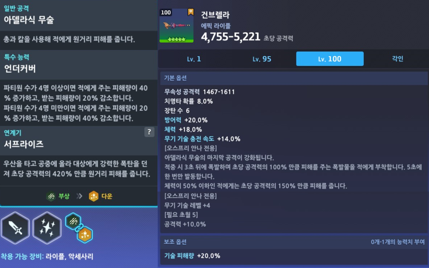 ㄴ 5성 최대 각성 시 파티 효과: [파티] 무기 기술 충전 속도 +30% / 기술 피해량 +30%