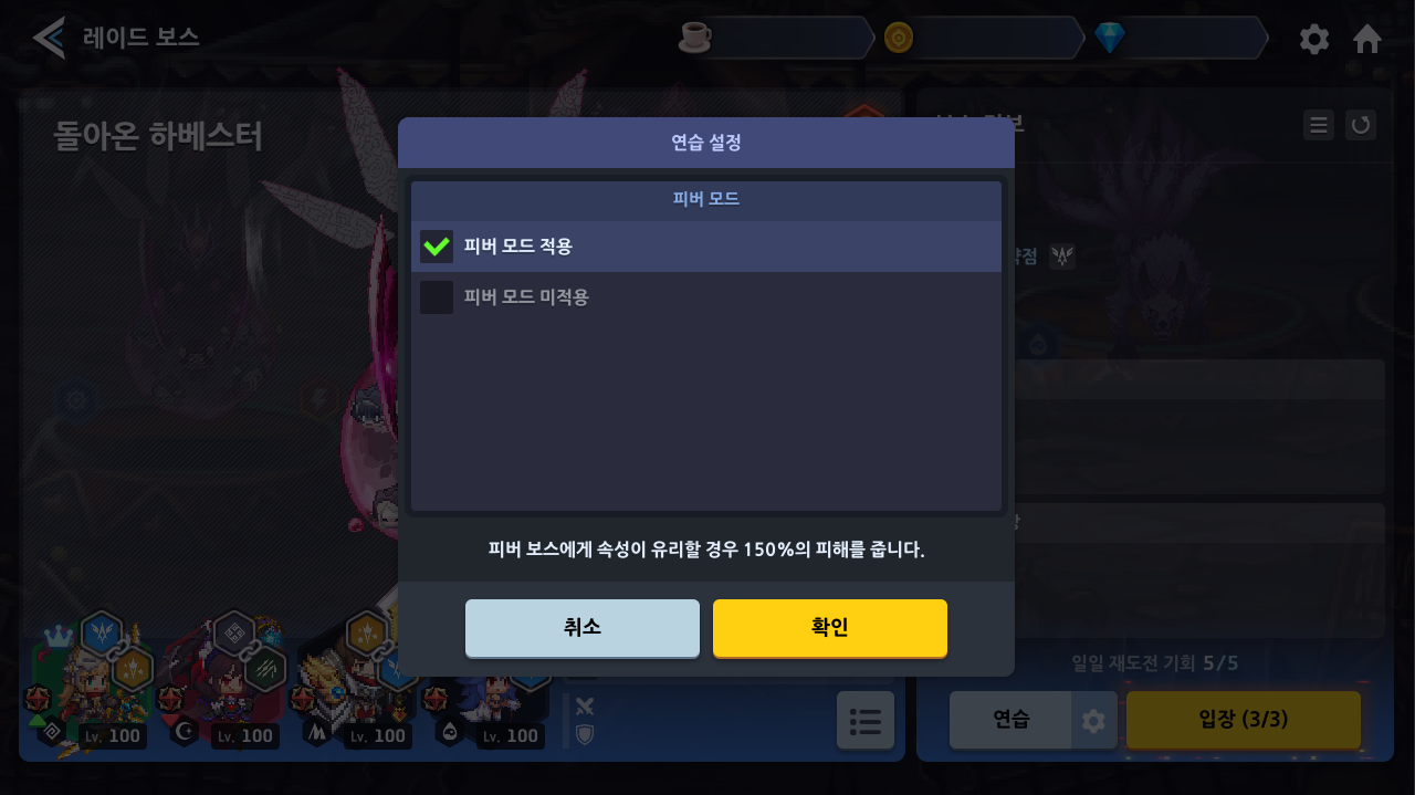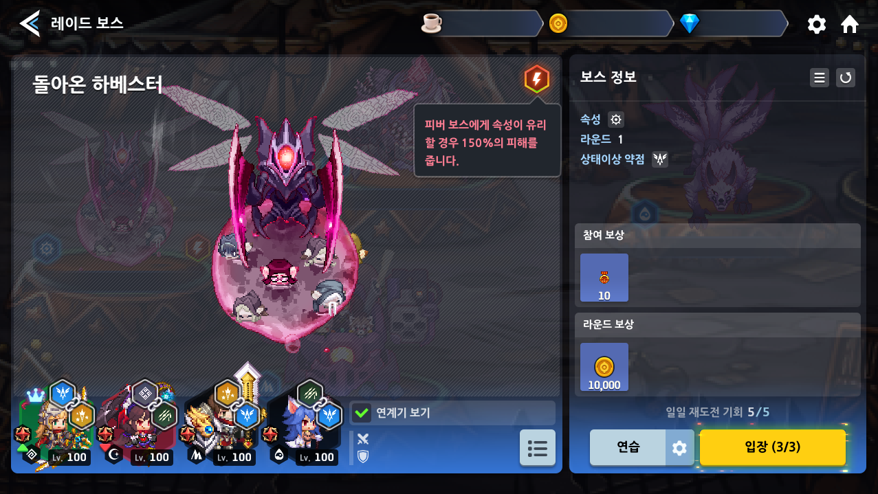 - 피버 보스를 공격할 때 속성이 유리할 경우 150%의 피해를 줍니다.