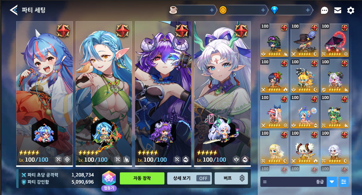 - 자동 장착 버튼을 통해 모험 파티에 배치된 영웅들의 장비를 적절한 장비로 교체할 수 있습니다.