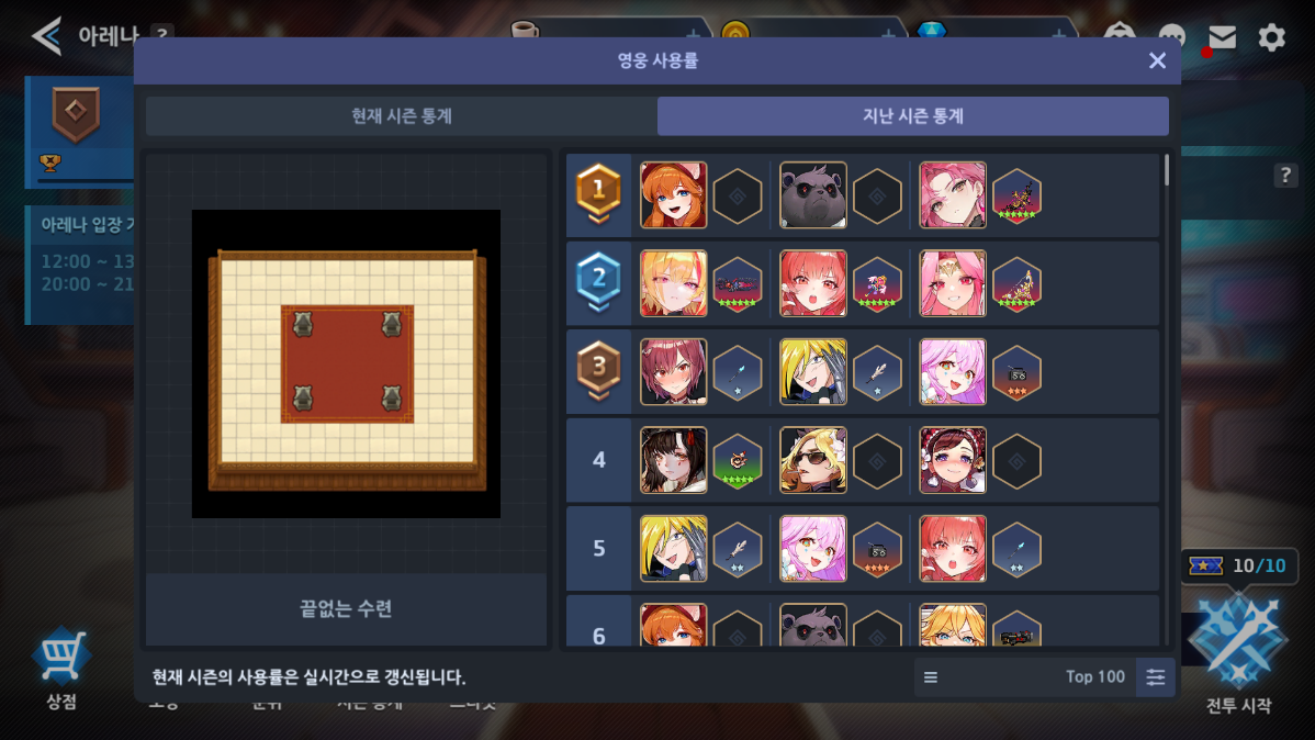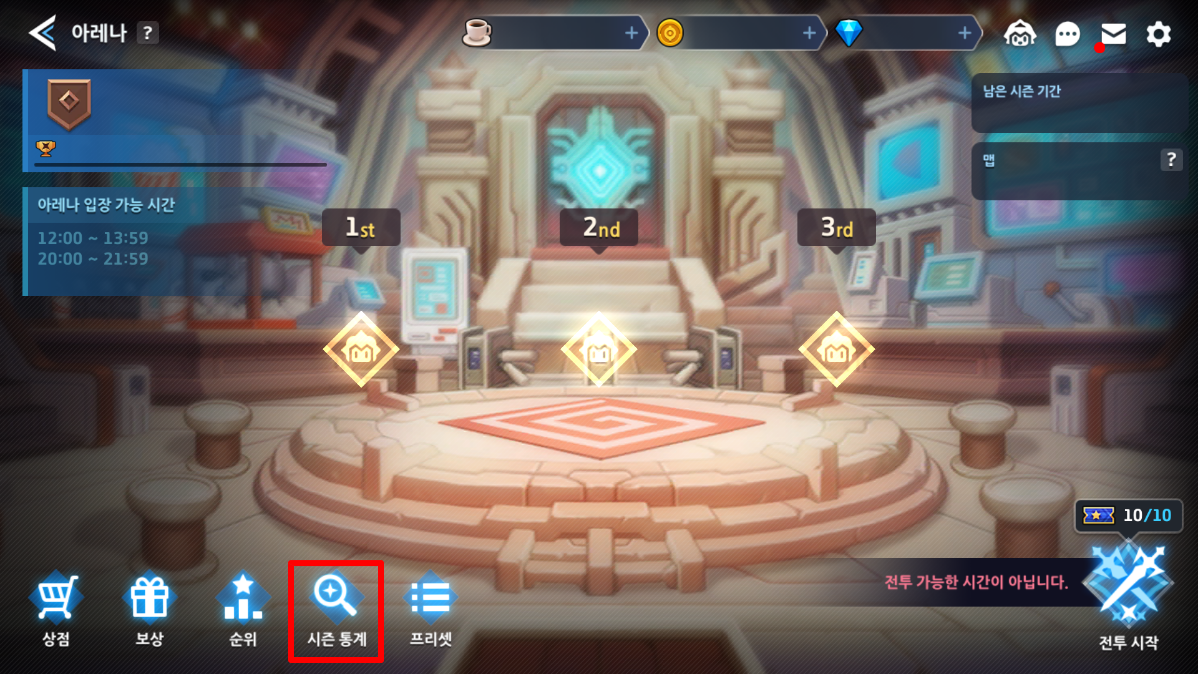 - 아레나 로비 하단의 '시즌 통계' 버튼을 통해 확인할 수 있습니다.