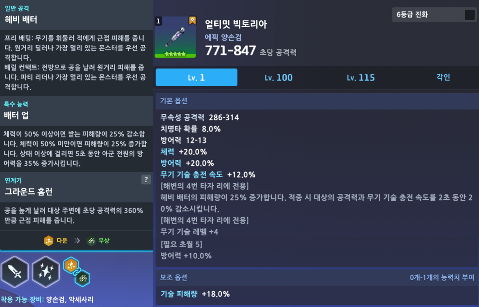 ㄴ 선택 가능한 에픽 전용 장비 : 얼티밋 빅토리아, 파죽지세, 엔젤 보이스