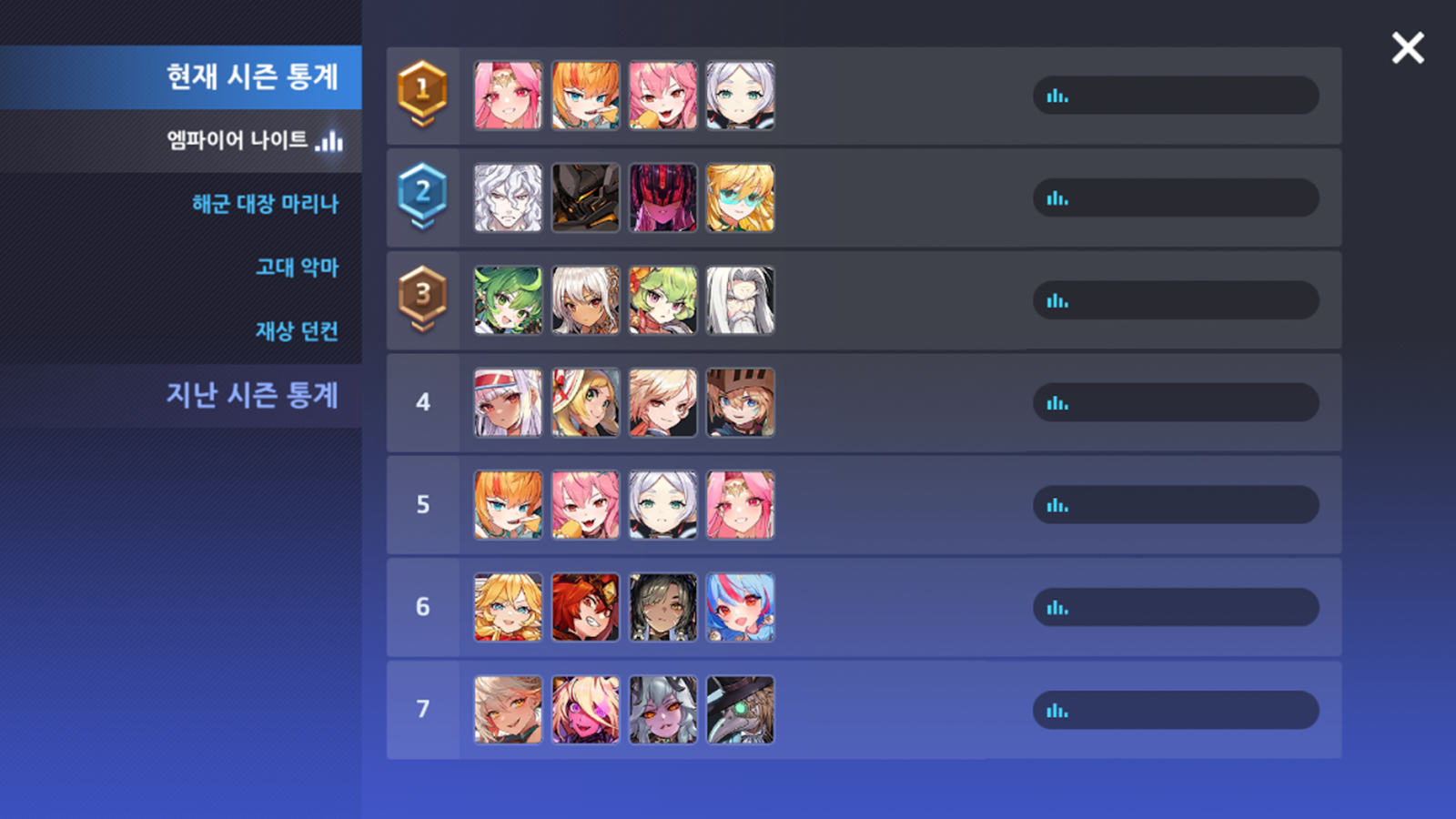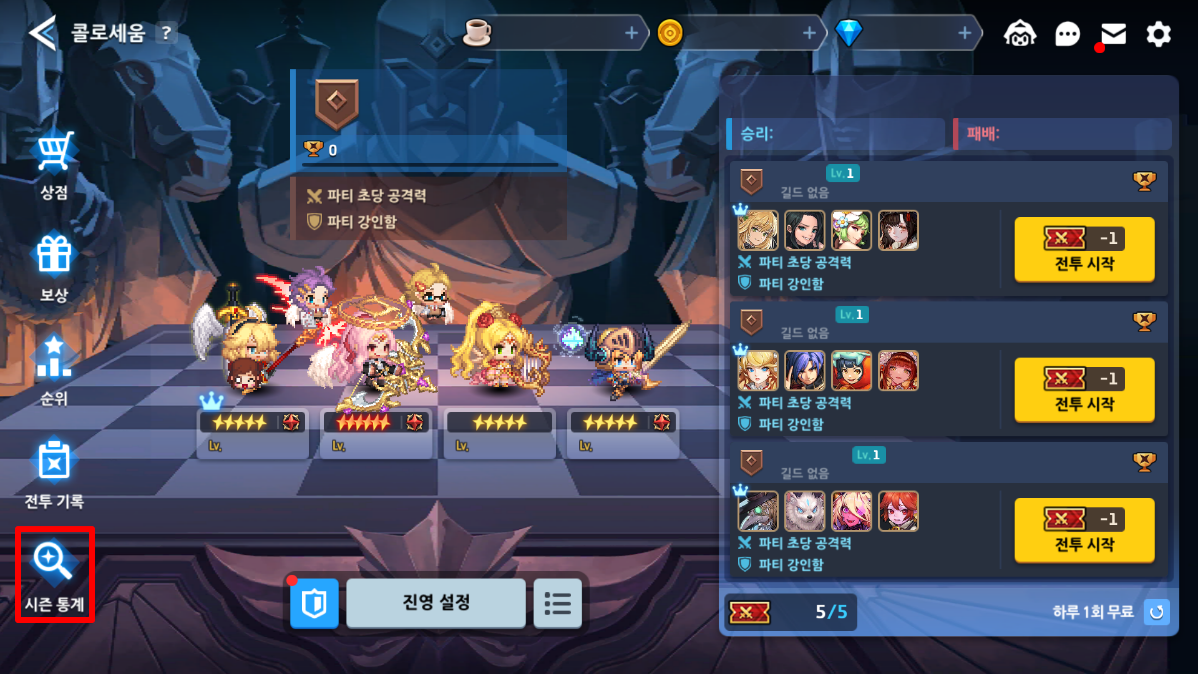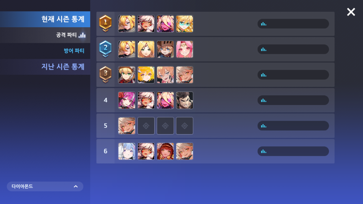 - 현재 시즌과 지난 시즌으로 나누어 확인할 수 있으며, 각 시즌 별 공격 파티와 방어 파티로 구분됩니다.