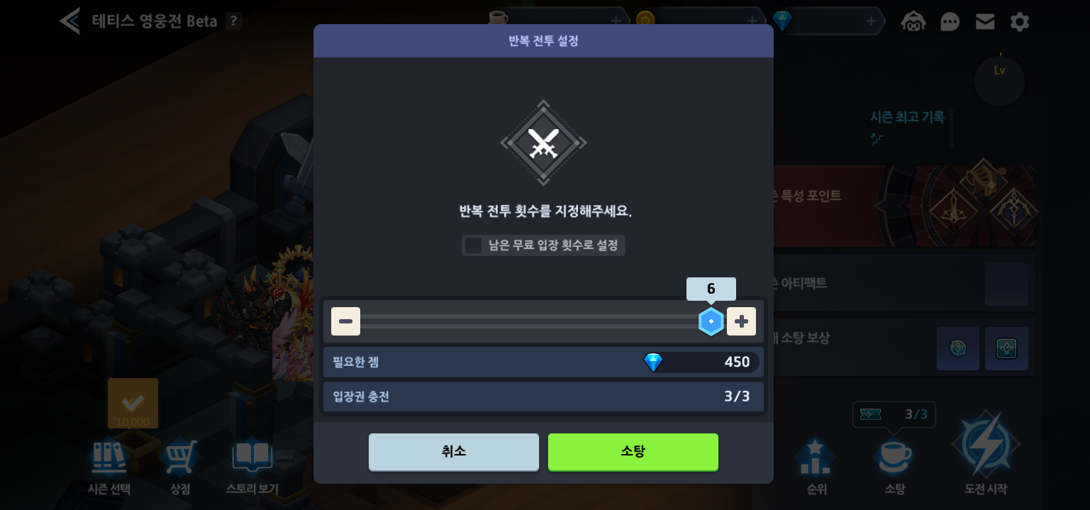 ㄴ 테티스 영웅전 소탕 팝업에서 '남은 무료 입장 횟수로 설정' 기능이 추가됩니다.