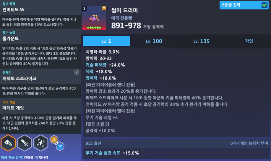 | [무기 기술 강화] ㄴ 초당 공격력의 280% 만큼 원거리 피해를 줍니다. | |