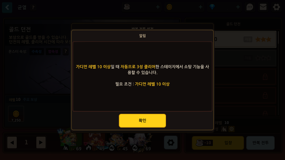 - 가디언 레벨이 증가할수록 소탕 할 수 있는 던전의 종류가 순차적으로 늘어납니다.