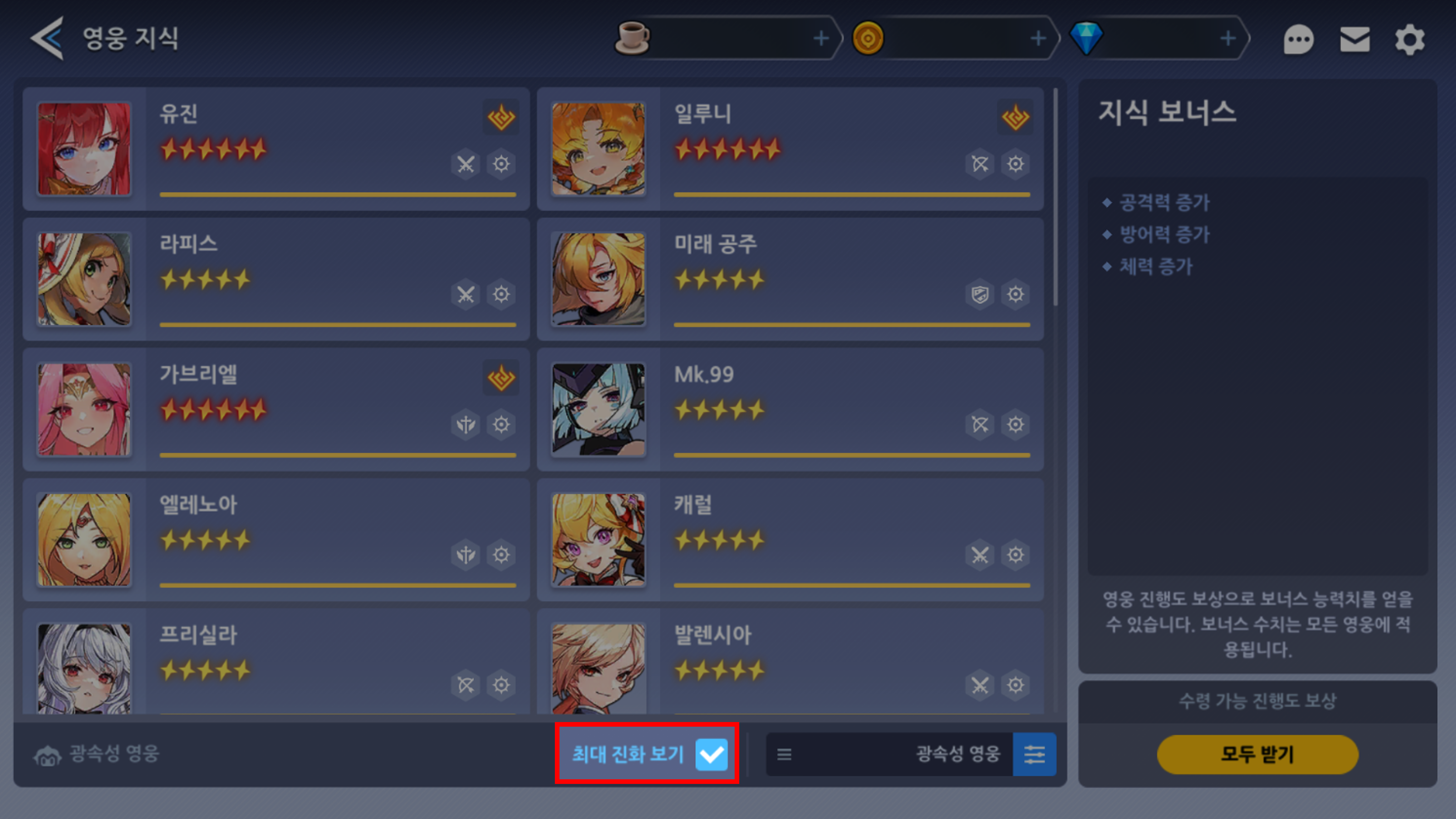 - 각 영웅들의 최대 진화를 한눈에 볼 수 있는 기능이 추가됩니다.