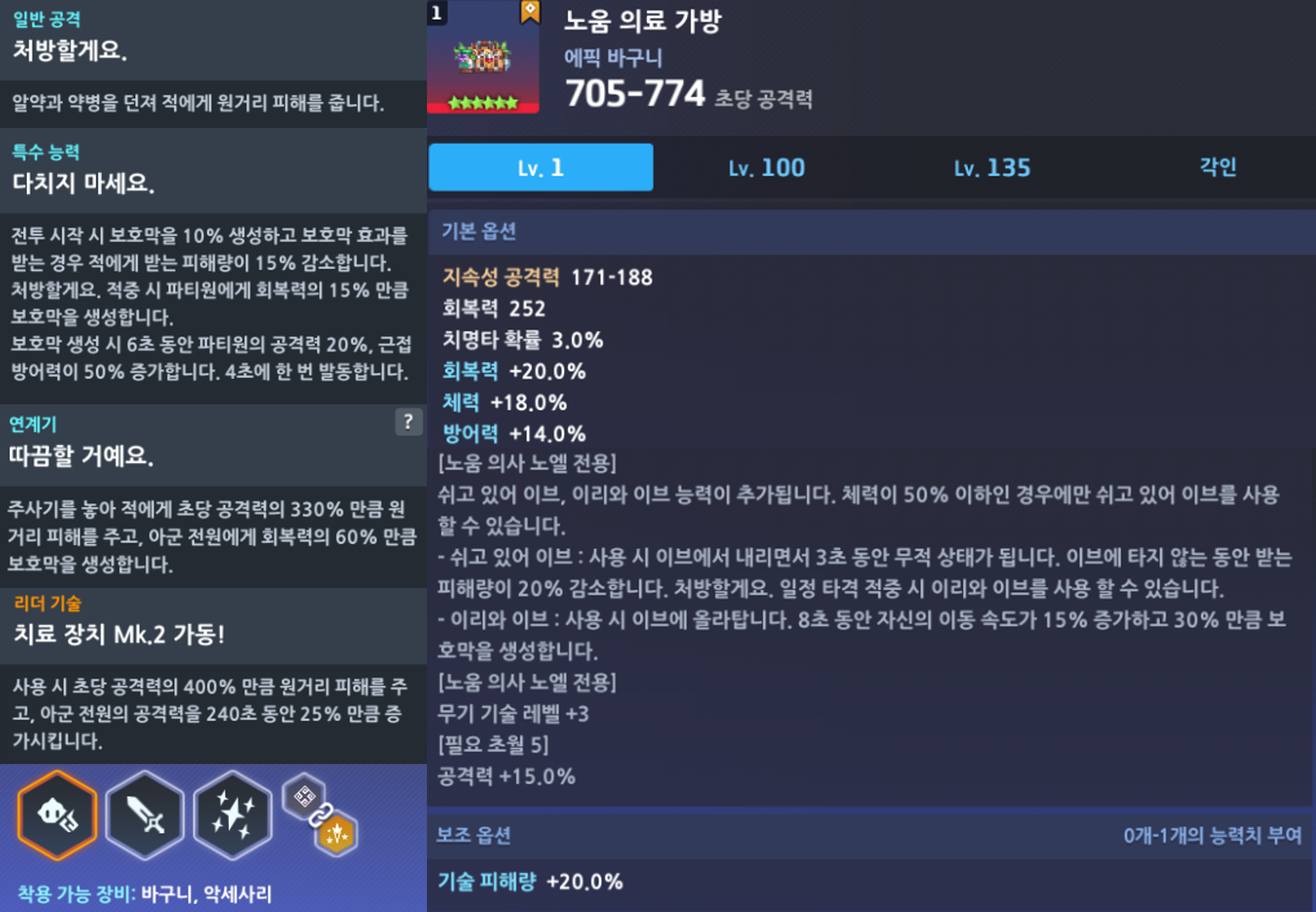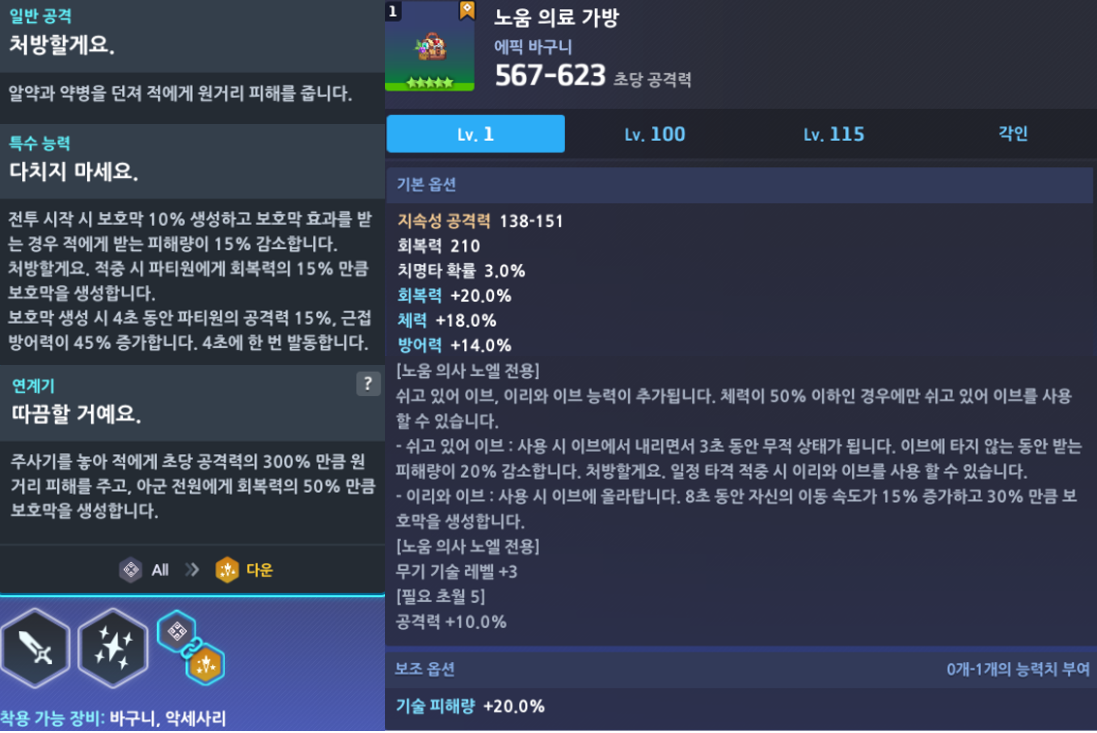 | [일반 공격 강화] ㄴ 처방할게요. 피해량이 5% 증가하고 약병 판정 범위가 50% 증가합니다. | |