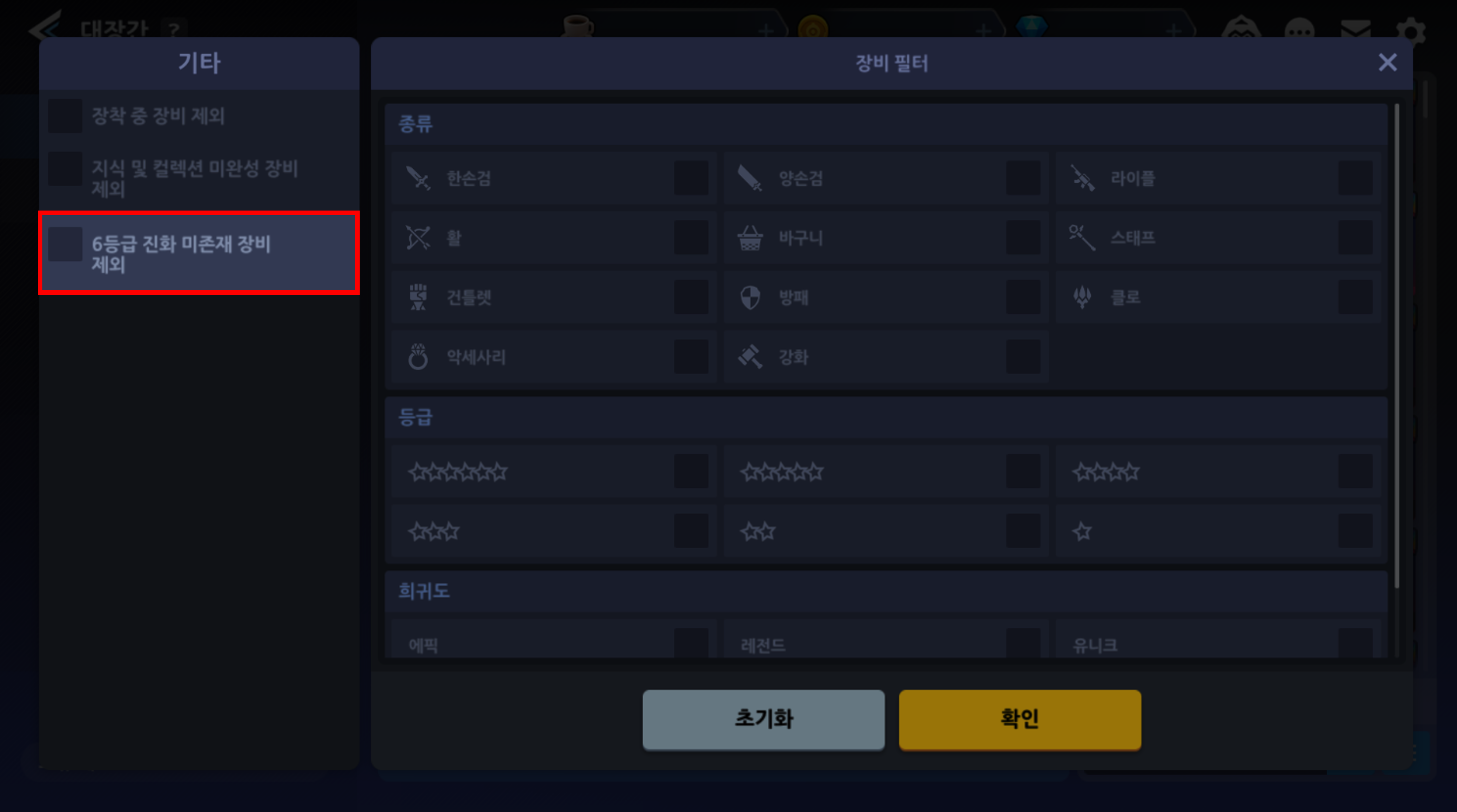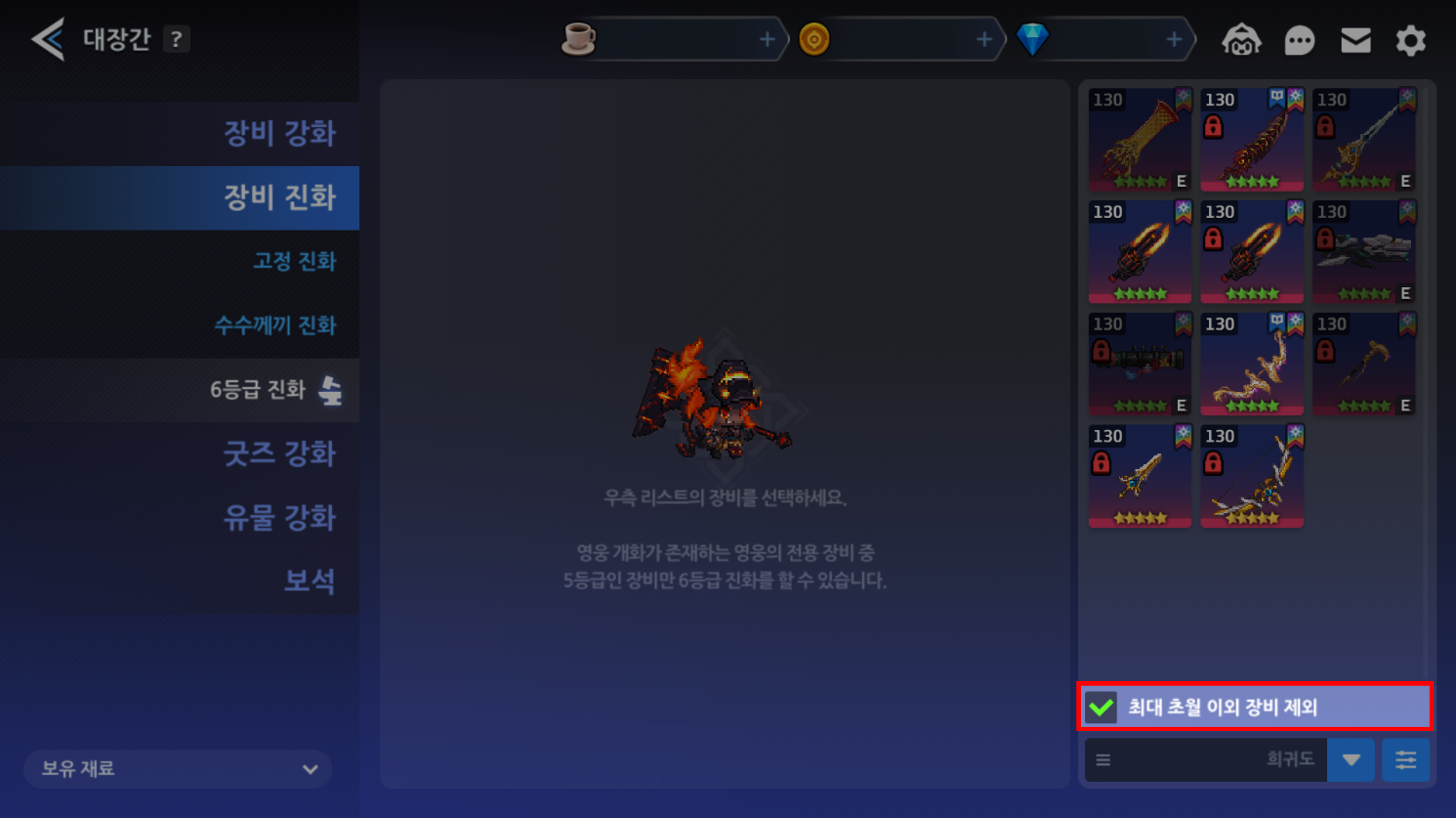 - 6등급 진화 화면에서 최대 초월 이외의 장비는 제외하는 필터가 추가됩니다.