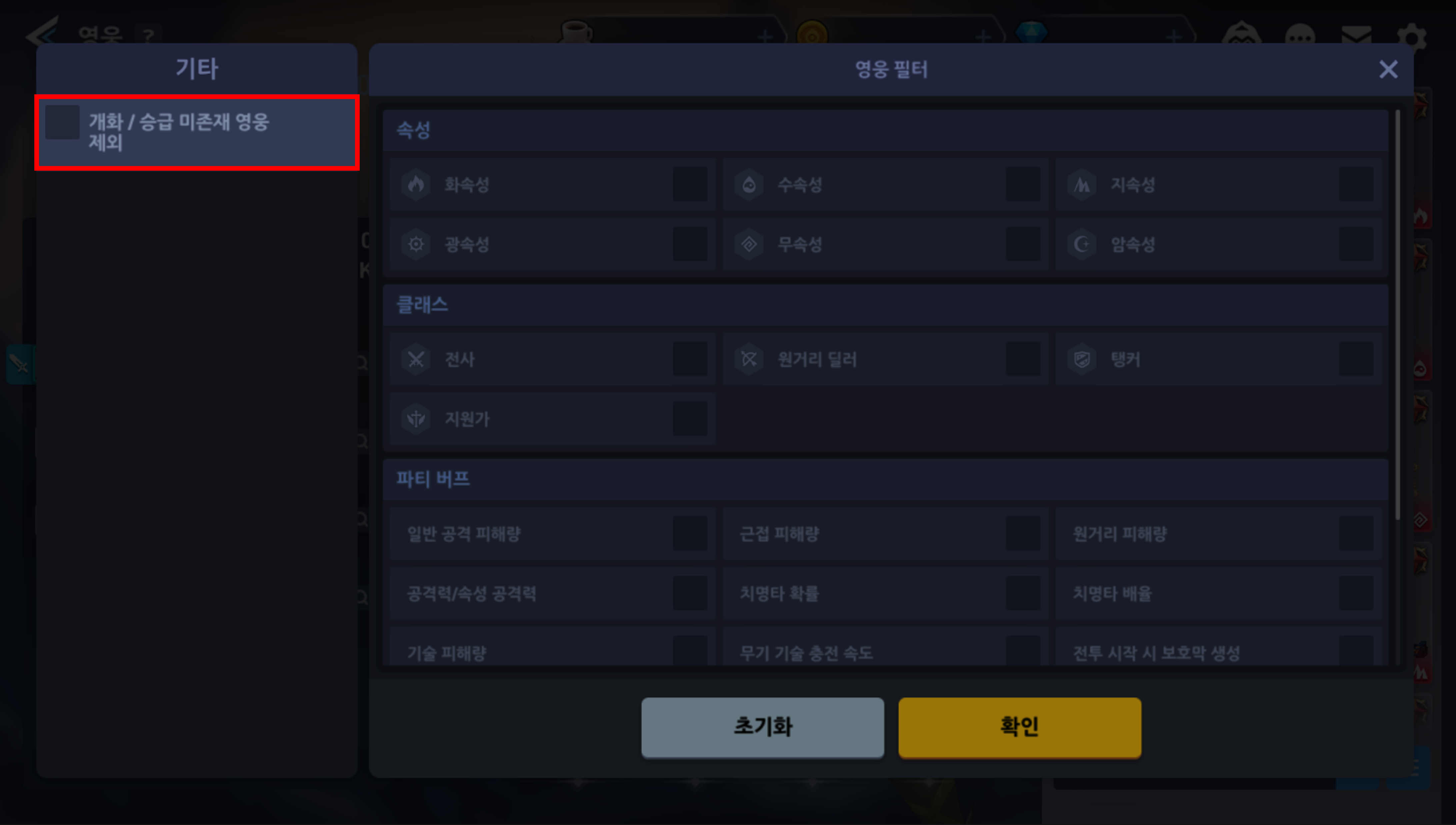 - 개화 / 승급 / 6등급 진화가 미존재하는 영웅 및 장비를 제외하는 필터가 추가됩니다.
