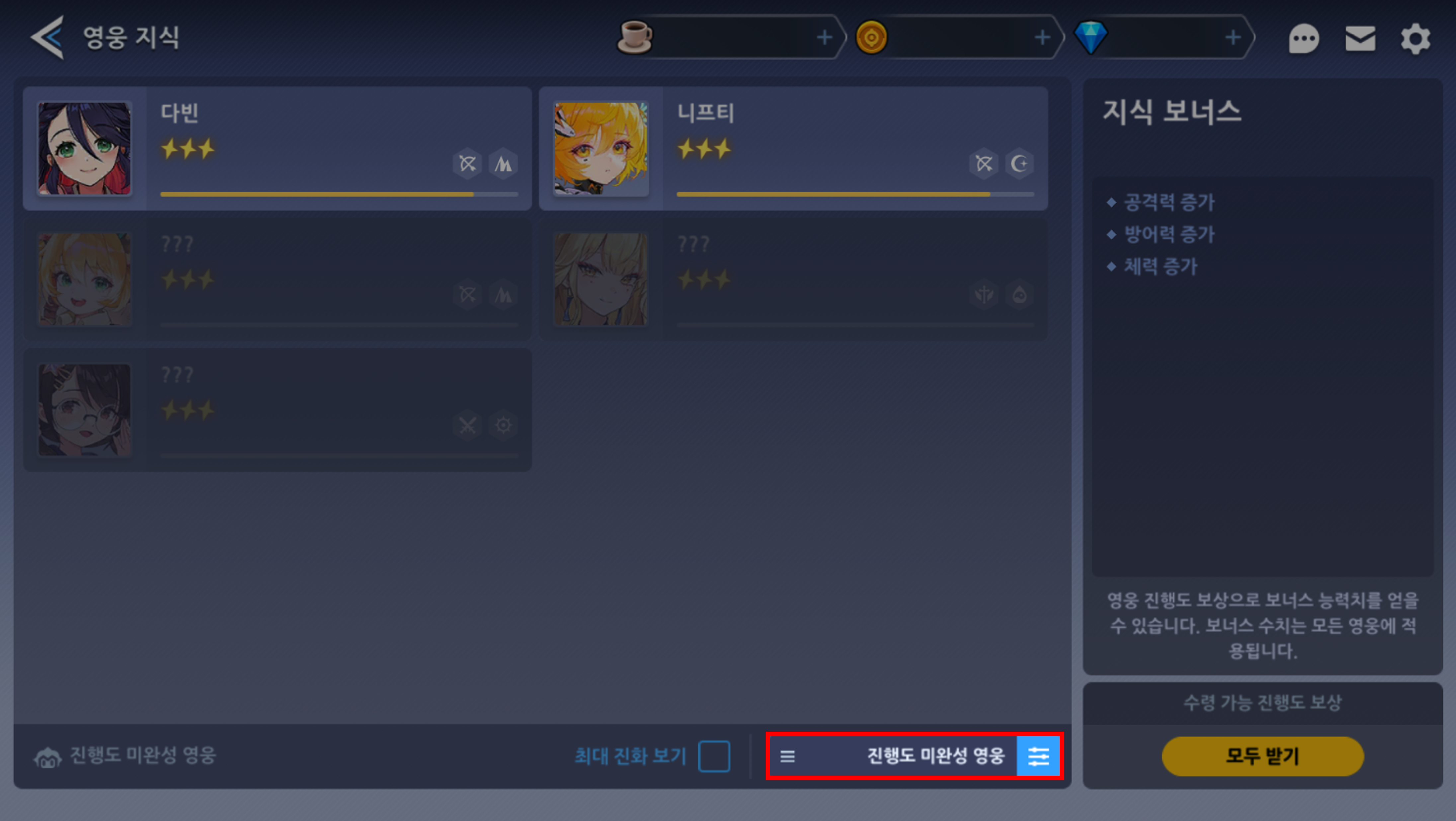 - 영웅 지식에서 진행도가 미완성인 영웅만 볼 수 있도록 하는 필터가 추가됩니다.