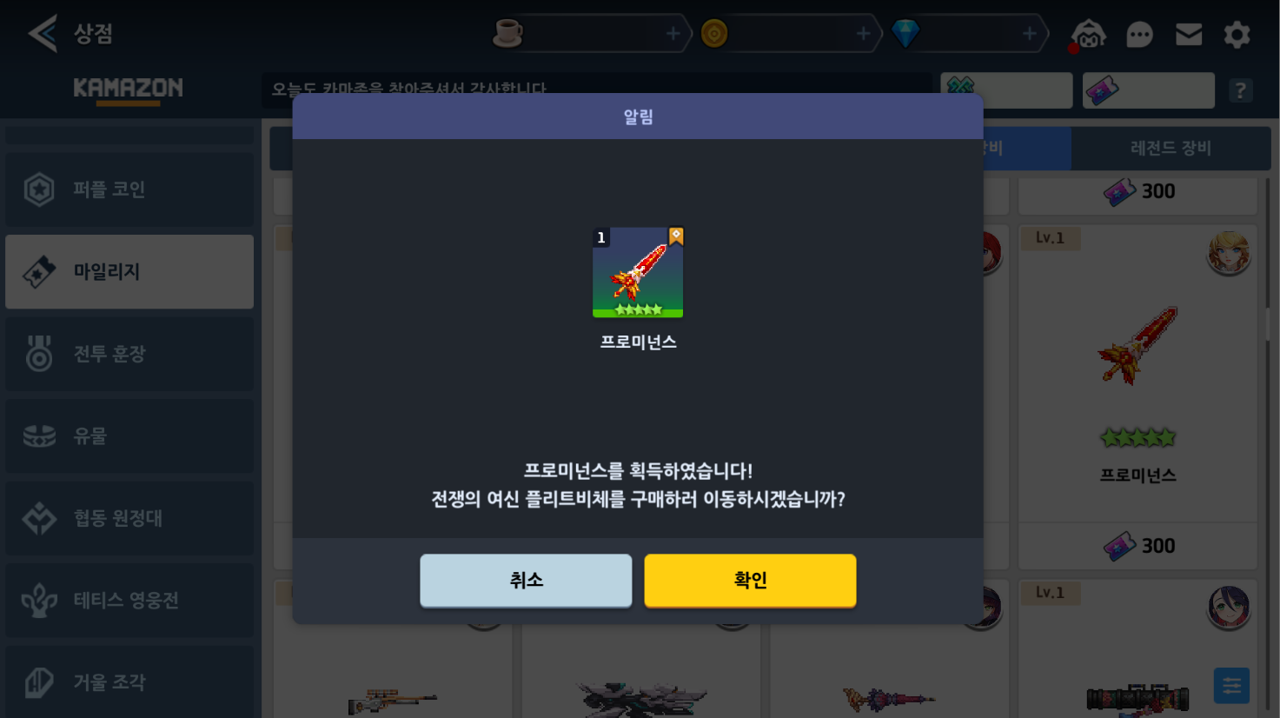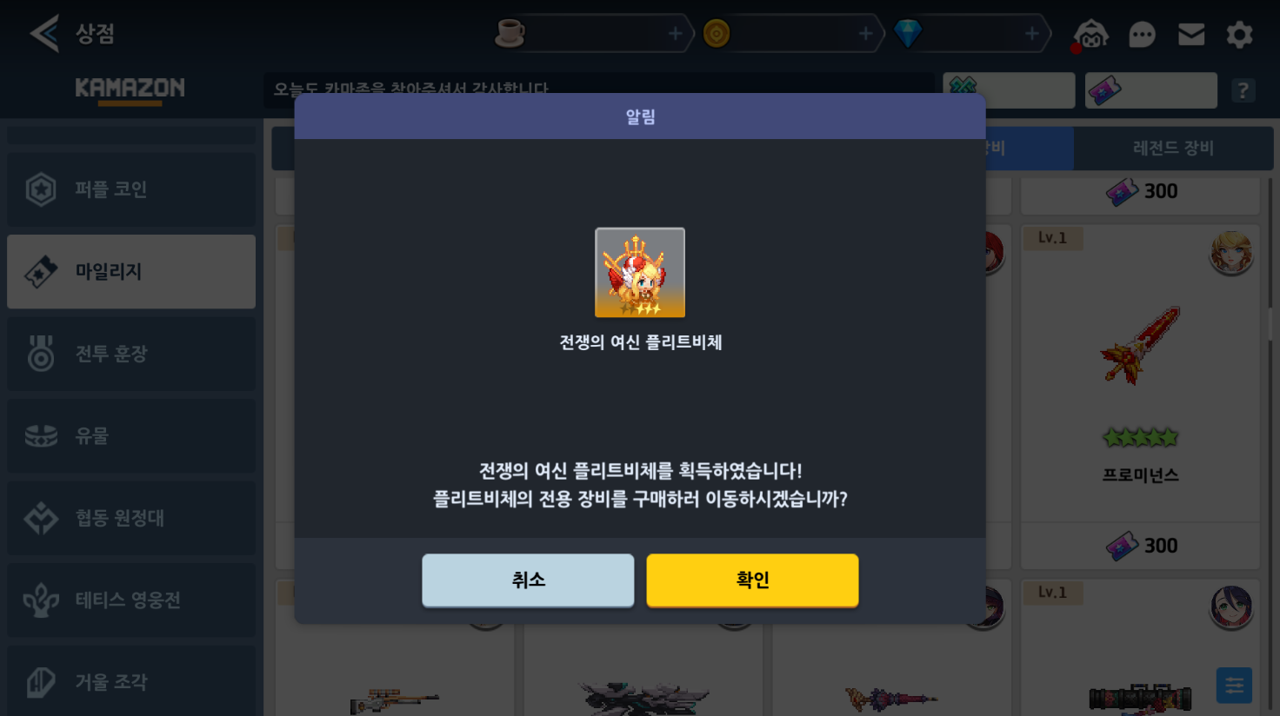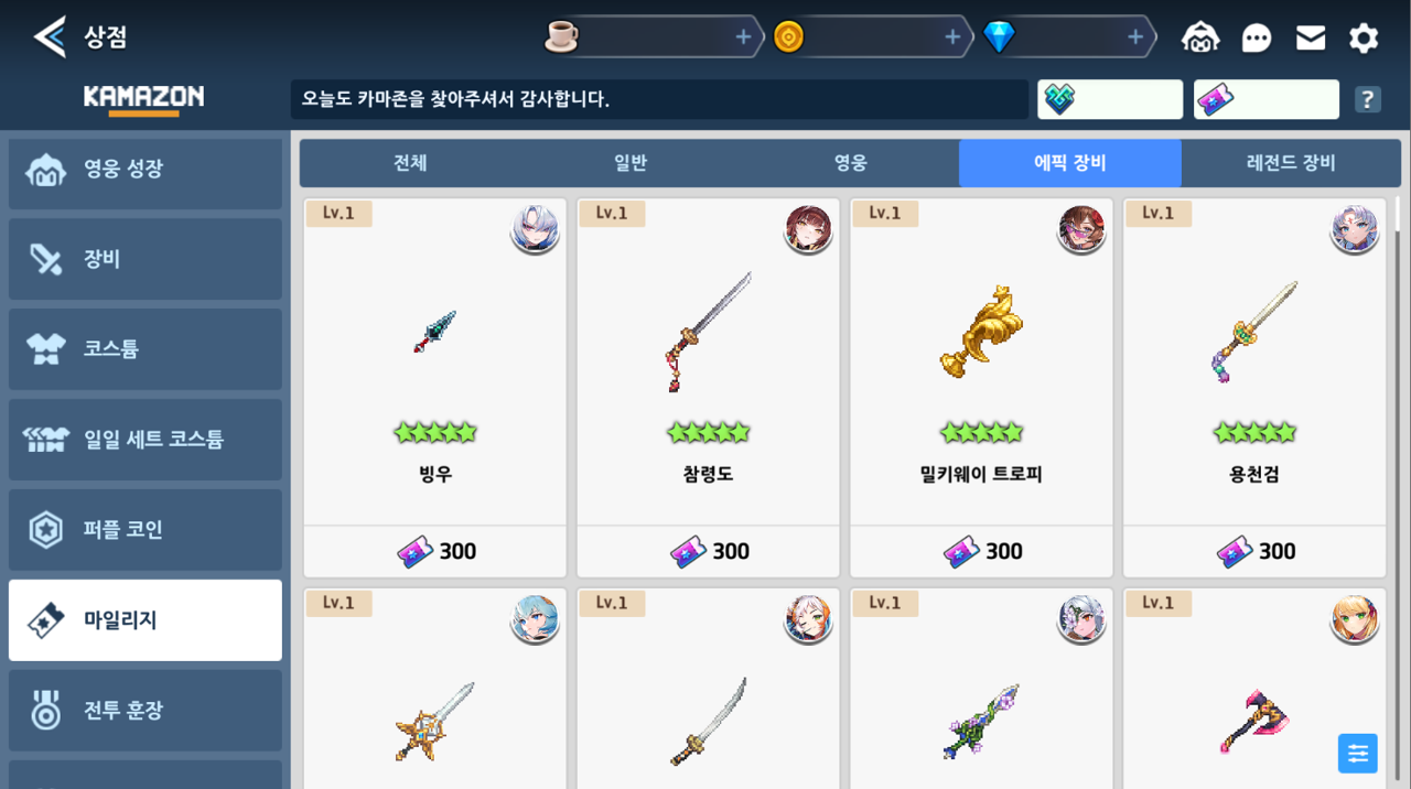 - 마일리지 카테고리의 에픽 장비, 레전드 장비 상품에 영웅 초상화가 함께 표시됩니다.