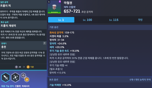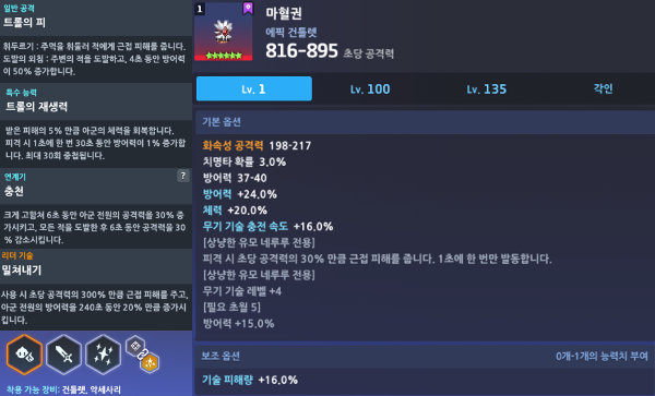 | 개화 변경점 | [리더 기술 추가 및 능력치 상승] - 밀쳐내기 ㄴ 사용 시 초당 공격력의 300% 만큼 근접 피해를 주고, 아군 전원의 방어력을 240초 동안 20% 만큼 증가시킵니다. |