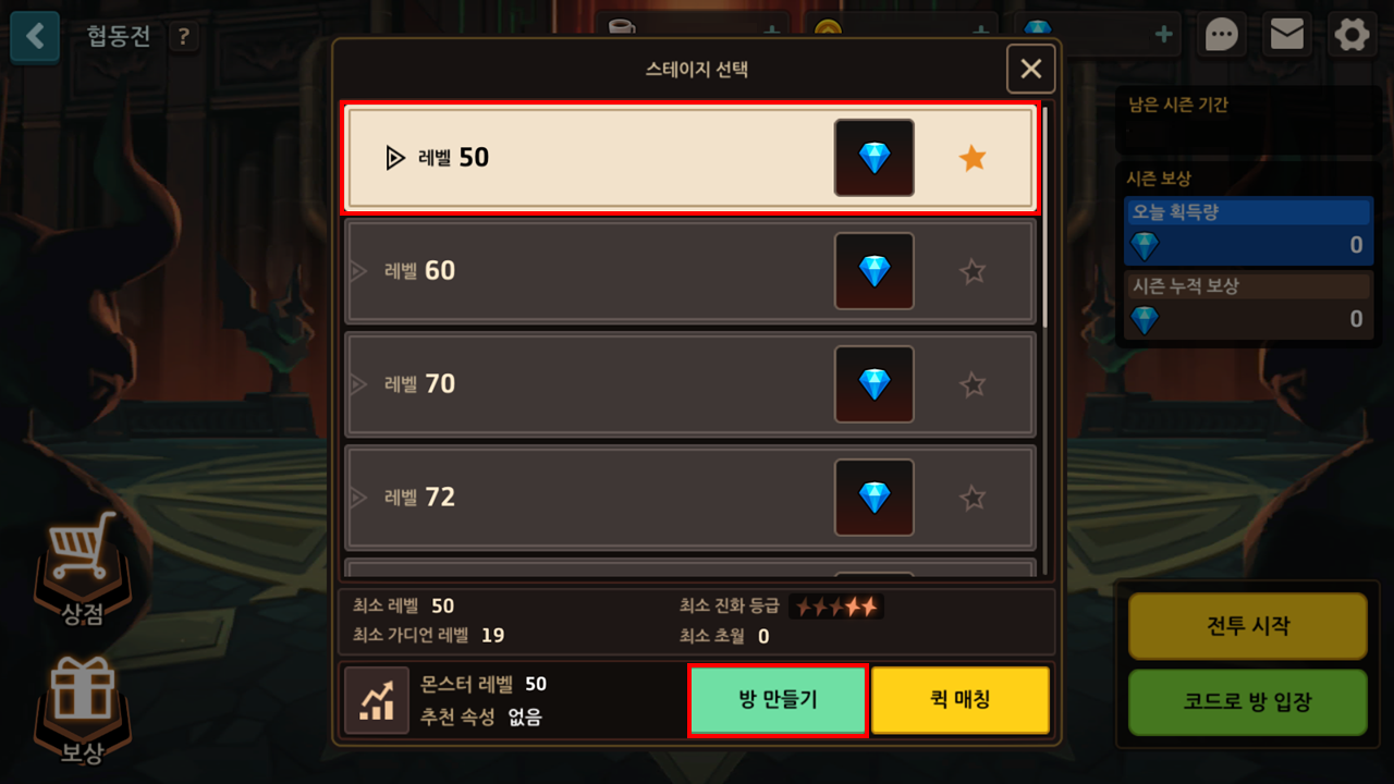 | 던전 레벨 | 진화석 개수 | 획득 골드 | 획득 경험치 |