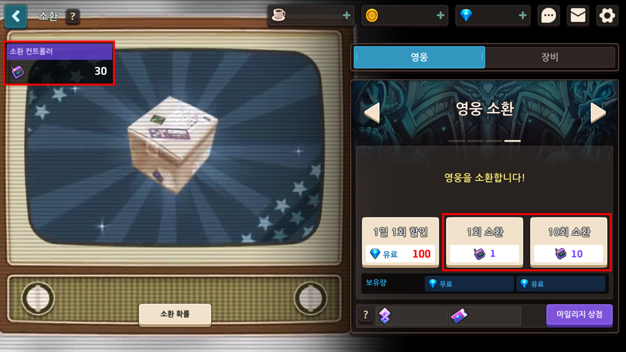 - 소환 컨트롤러를 사용해도 마일리지, 매직 메탈, 히어로 크리스탈 등은 동일하게 획득합니다.