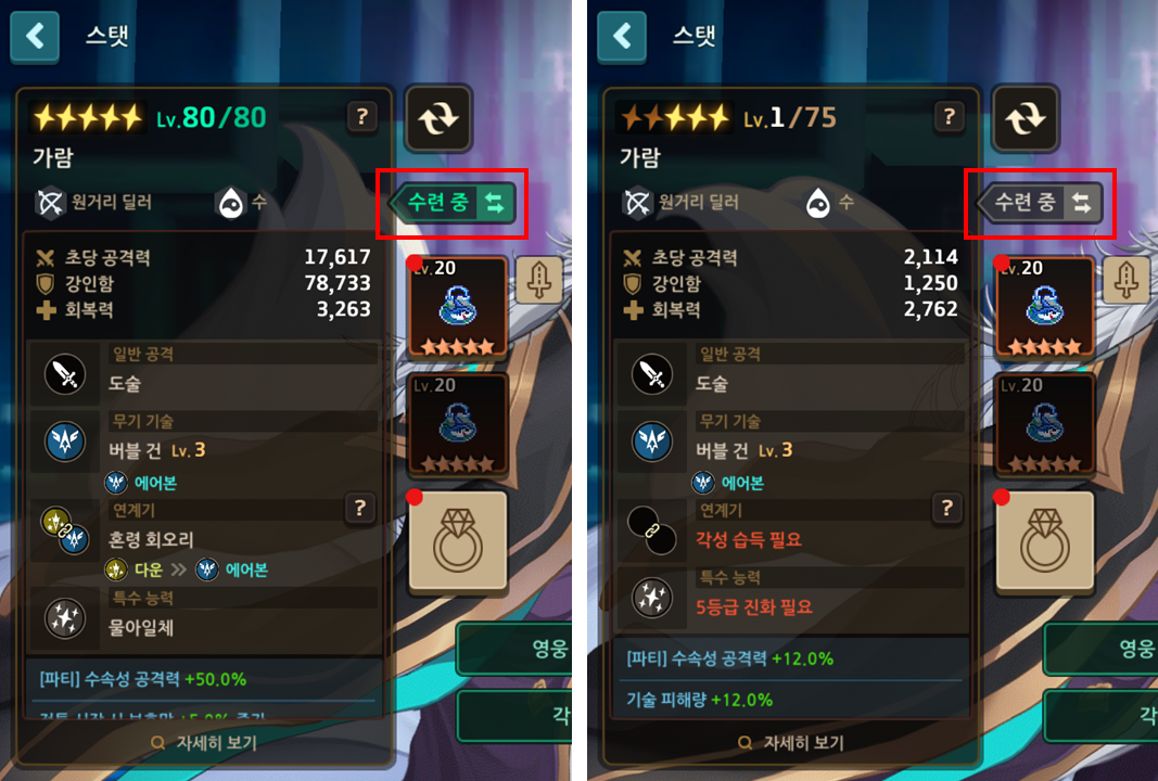 - 수련 중인 영웅의 [수련 중] 버튼 터치 시 레벨, 진화, 각성, 초월 상태를 확인할 수 있습니다.