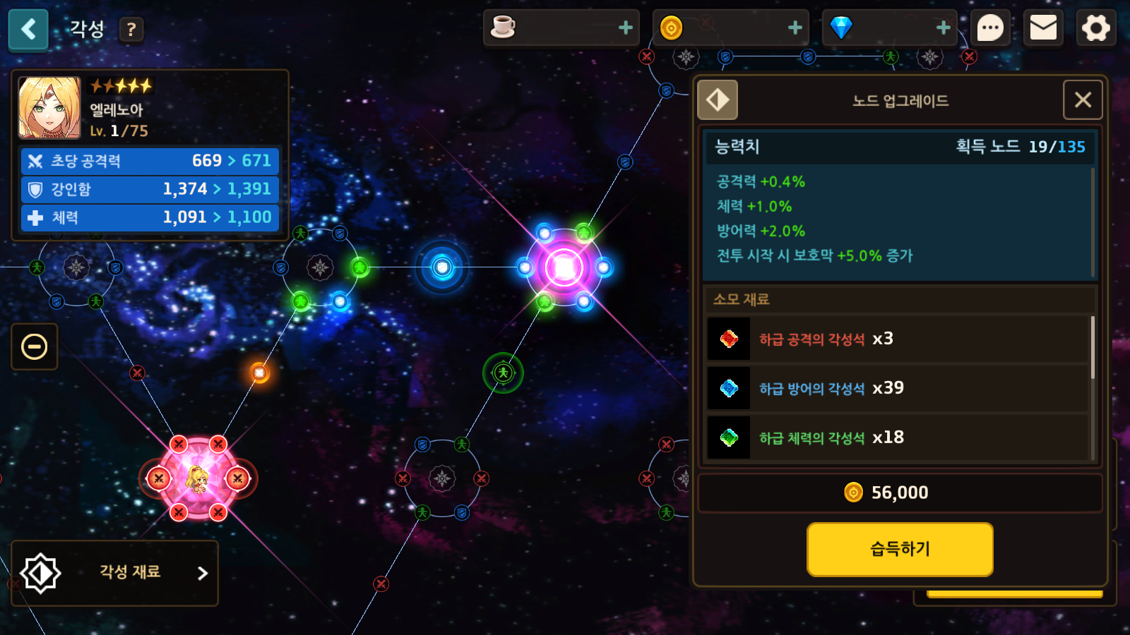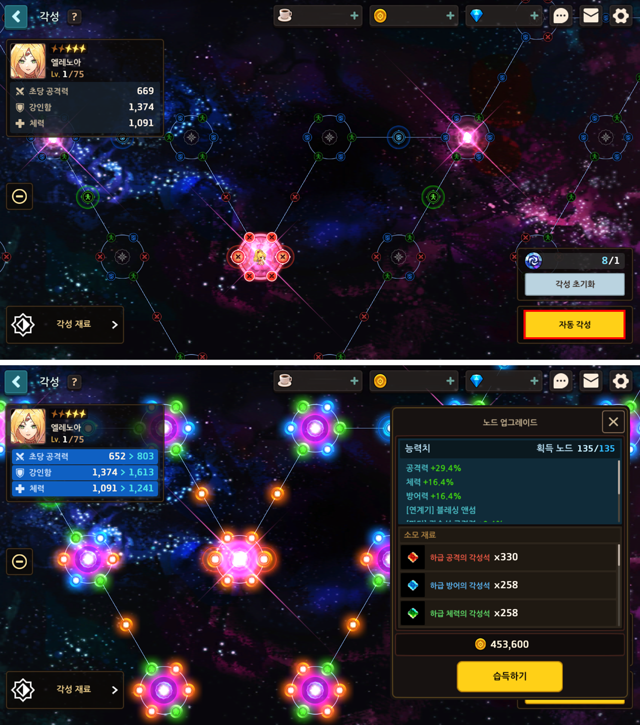 - 자동 각성 버튼을 누르면 현재 보유한 재화로 습득할 수 있는 최대한의 노드를 모두 습득할 수 있는 기능이 추가됩니다.