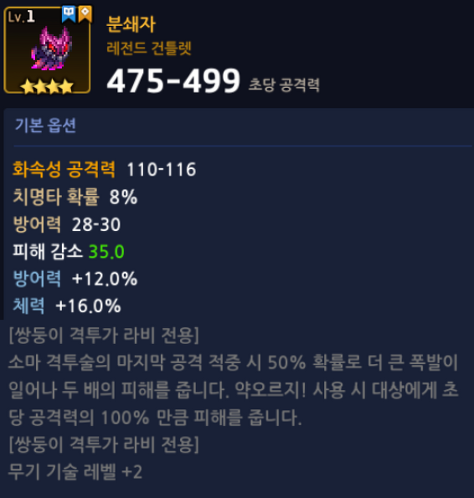 - 쌍둥이 격투가 라비의 전용 무기인 '분쇄자'를 획득할 수 있습니다.
