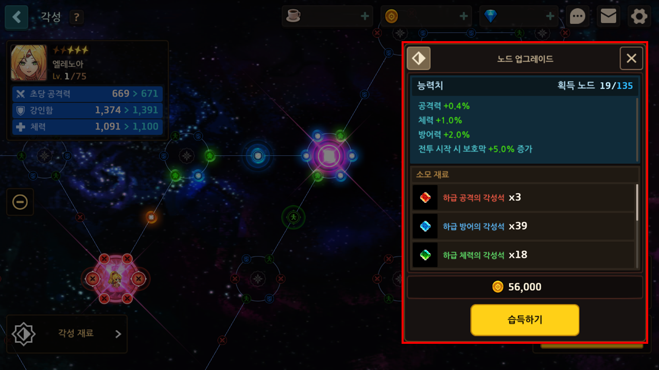 - 선택된 노드들을 습득했을 때 획득하는 능력치와 소모 재료를 모두 확인할 수 있도록 개선됩니다.