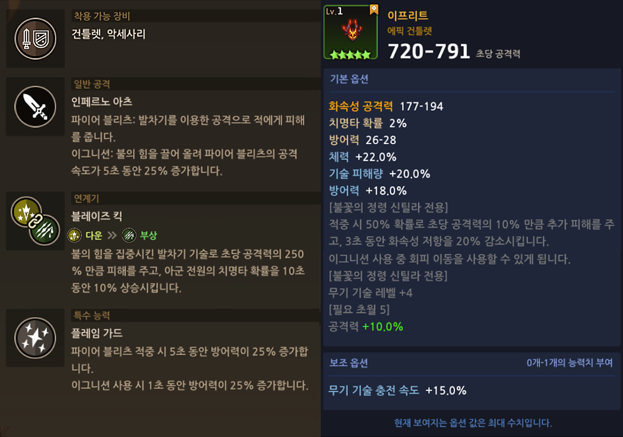 | 희망 (상급) | 무기 기술 충전 속도 +50% 기술 피해량 +100% |