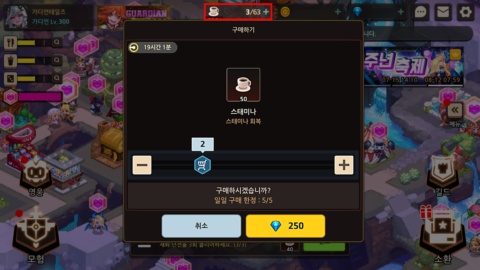 - 젬으로 구매할 수 있는 스태미나 상품을 상단 스태미나 UI를 눌렀을 때 구매할 수 있도록 수정됩니다.