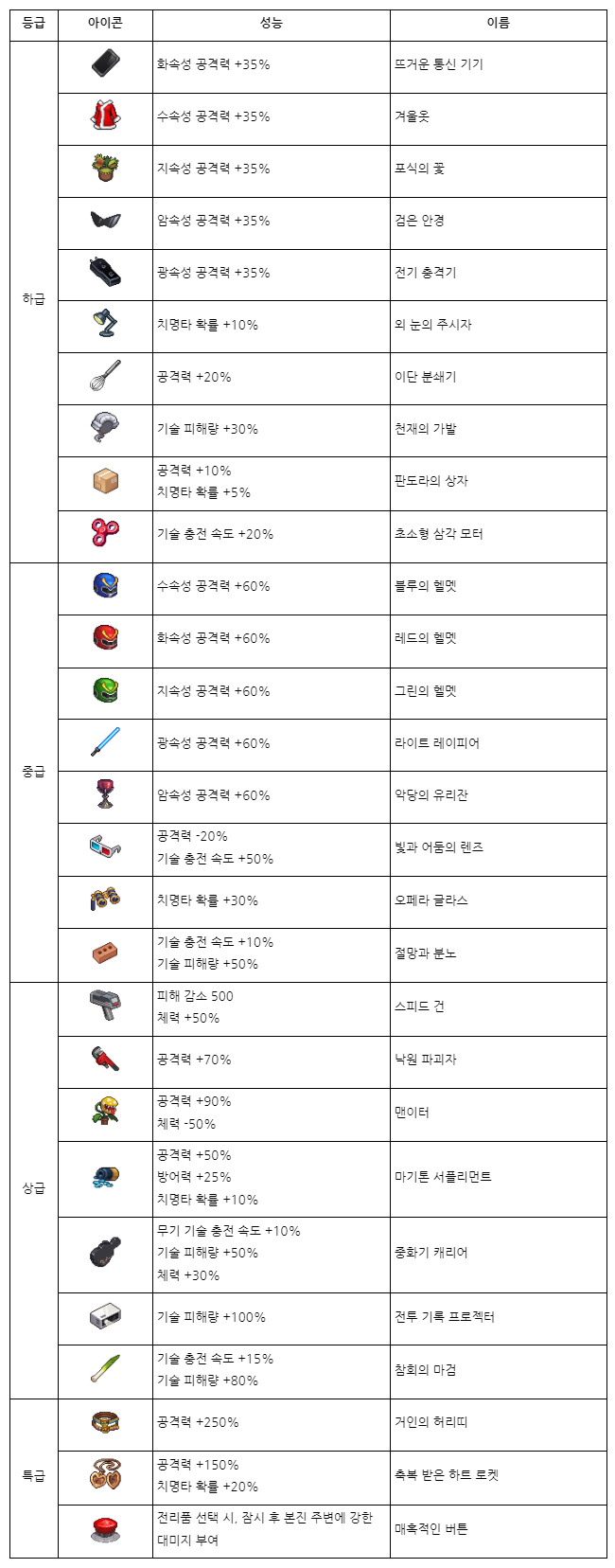 [변경] (하급) 천재의 가발, (하급) 판도라의 상자, (상급) 맨이터, (상급) 마기톤 서플리먼트, (상급) 중화기 캐리어