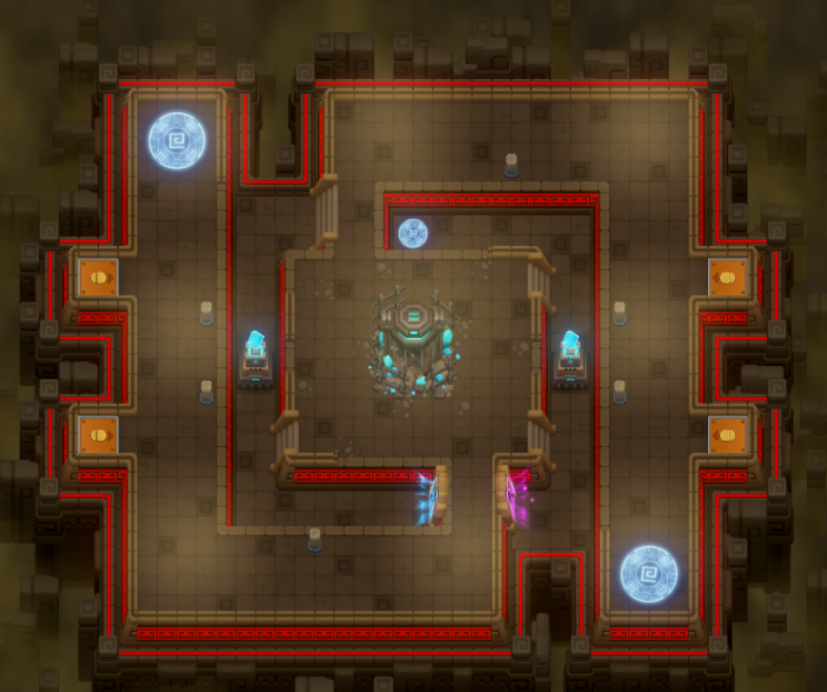 - 각 마법진에서 랜덤으로 웨이브가 시작되며 모든 몬스터는 거점을 향해 이동합니다.