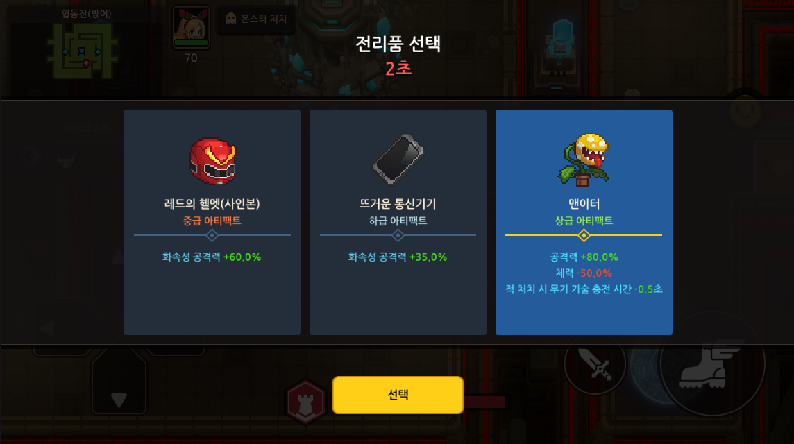 - 각 웨이브 종료 시, 전리품을 선택 하여 게임을 조금 더 수월하게 진행 할 수 있습니다.