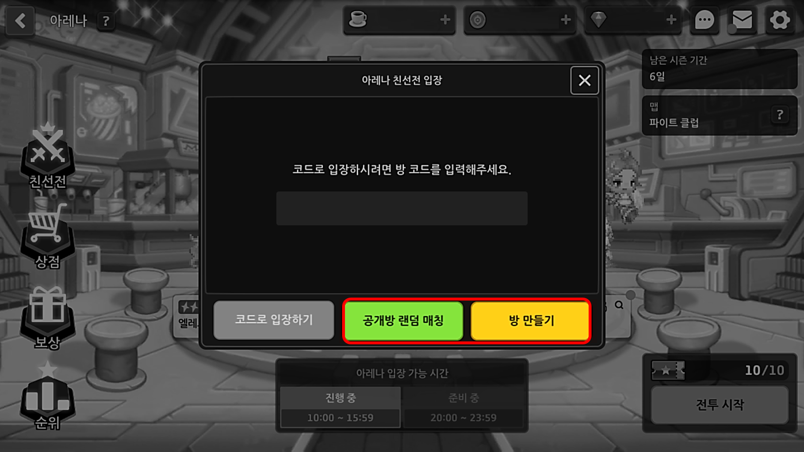 ㄴ 친선전 입장 시 [방 만들기]를 터치하여 공개방 또는 비공개방을 생성할 수 있게 됩니다.