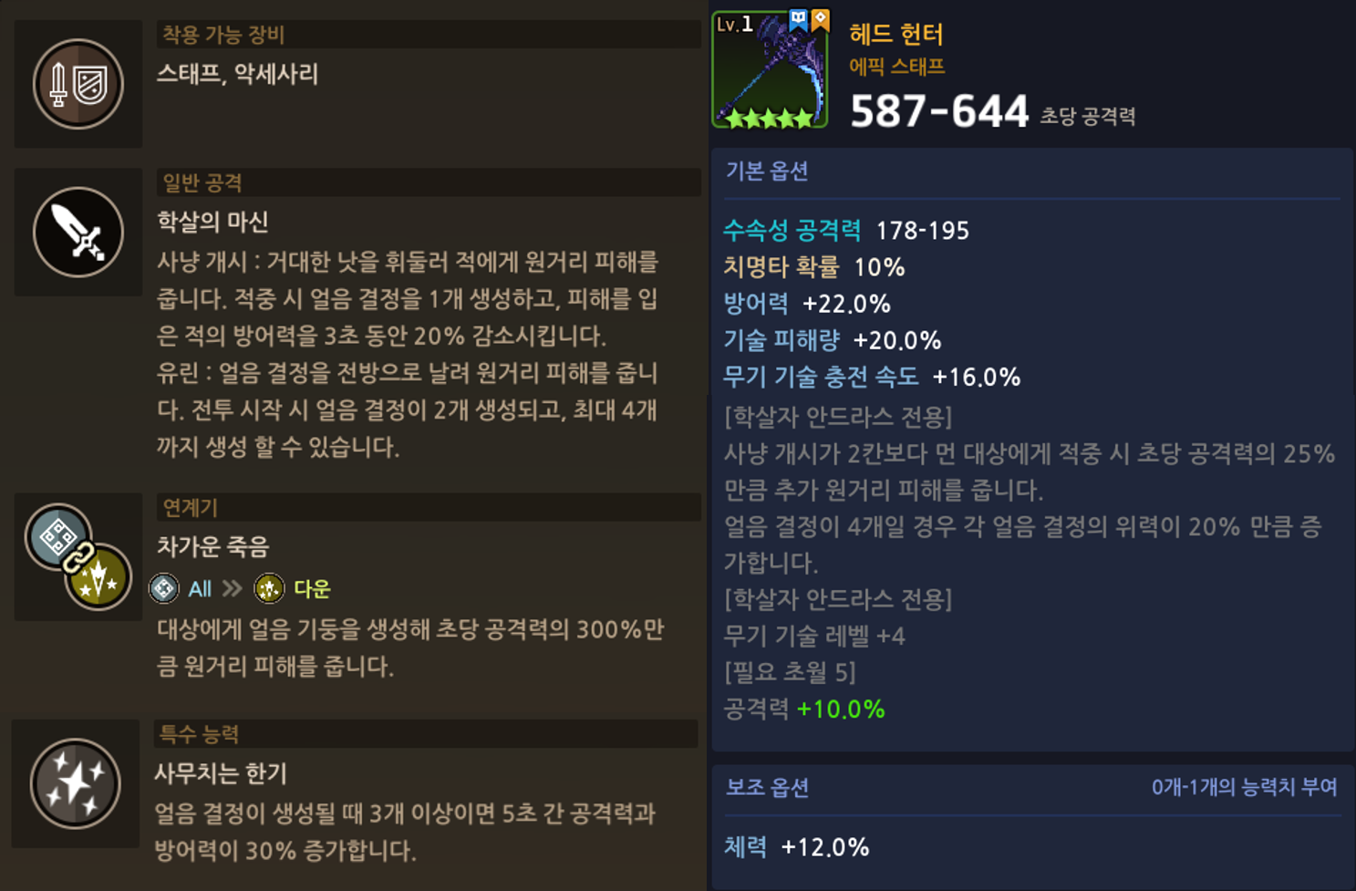 | 피스메이커 (상급) | 보스 몬스터에게 가하는 피해량 +50%, 면역, 포격, 거대화 몬스터에게 가하는 피해량 +50%, 치명타 배율 +50% |