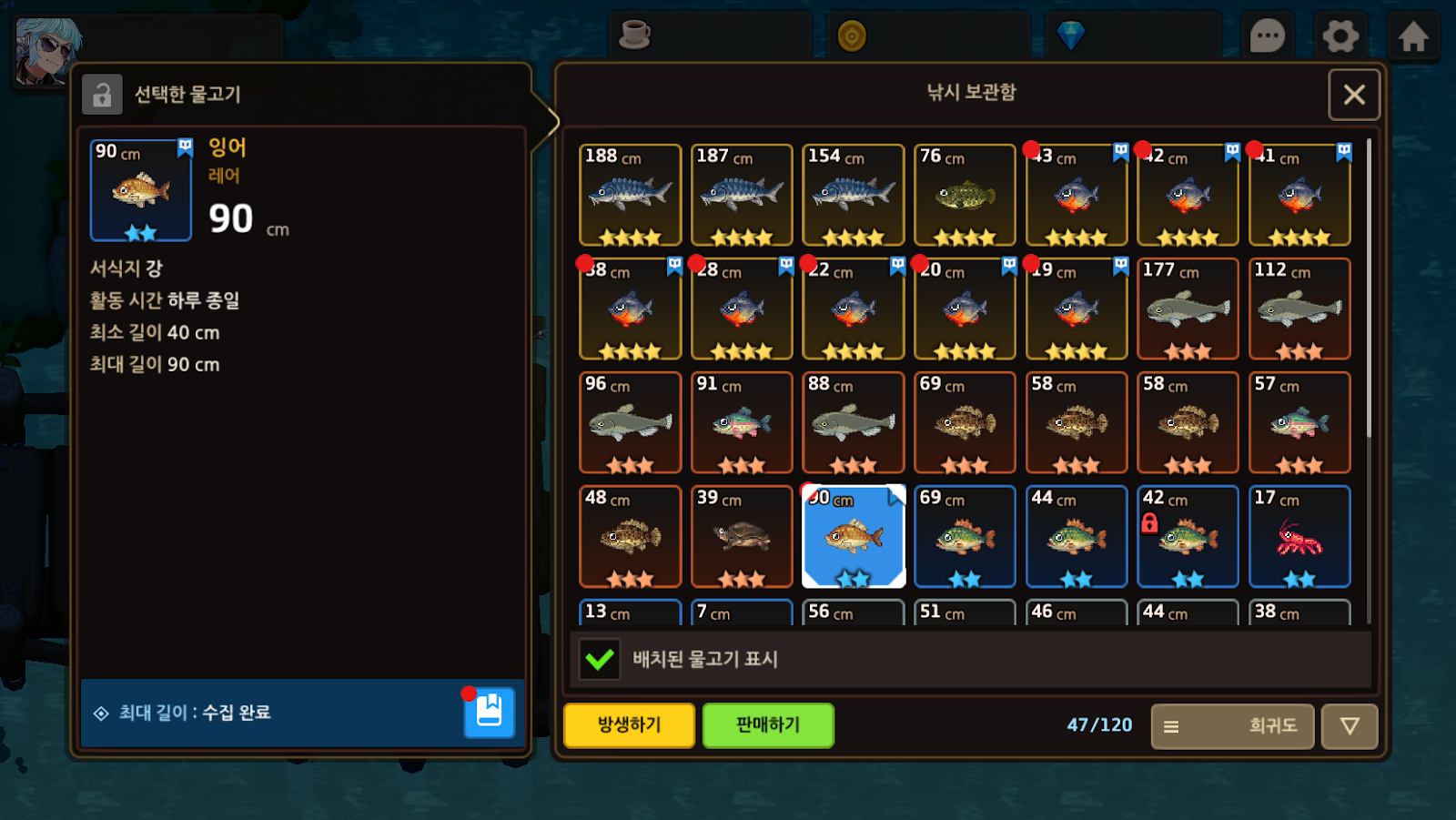 - 낚시 보관함 및 수조 관리 창에서 도감 보상을 받을 수 있는 물고기에 레드닷이 표시되도록 개선됩니다.