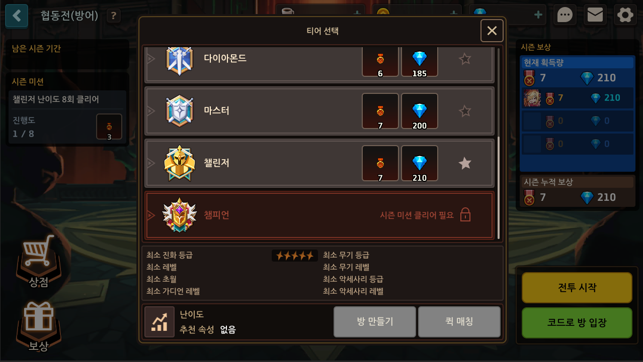 - 챔피언 티어에 입장하기 위해서는 챌린저 티어 도전을 8회 성공해야 합니다.