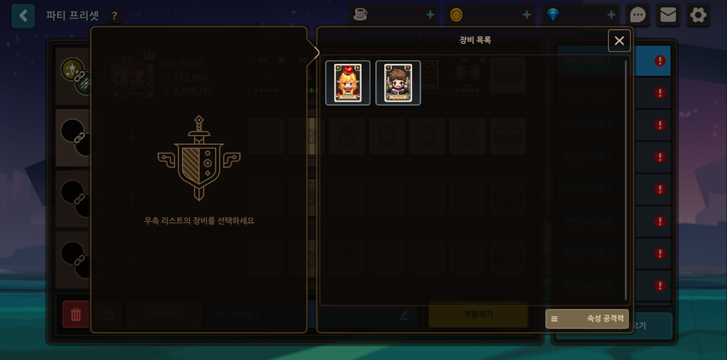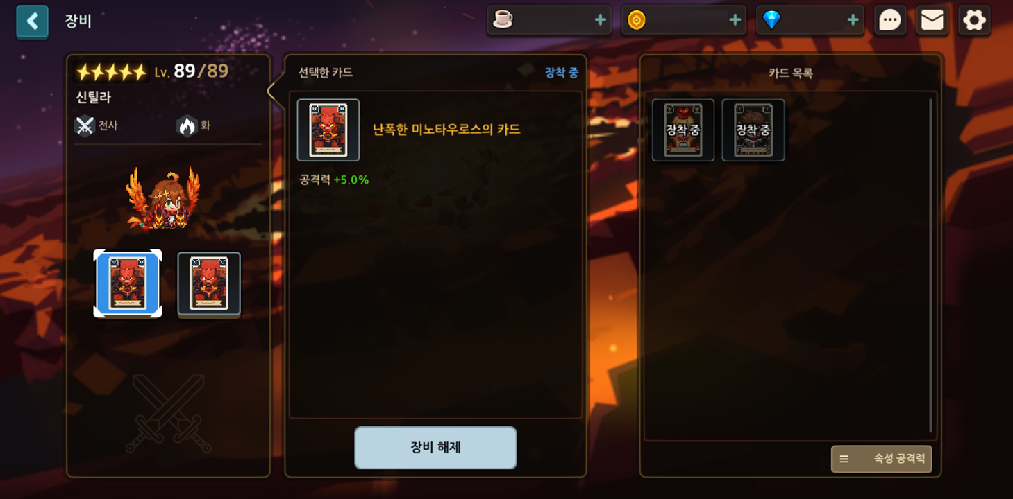 - 속성 공격력 선택 시 6가지 속성의 공격력 증가 카드를 모두 확인할 수 있습니다.