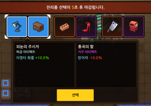- 각 웨이브 종료 시, 무작위로 제시되는 3개의 묶음 중 1개를 선택하여 스테이지를 진행할 수 있습니다.