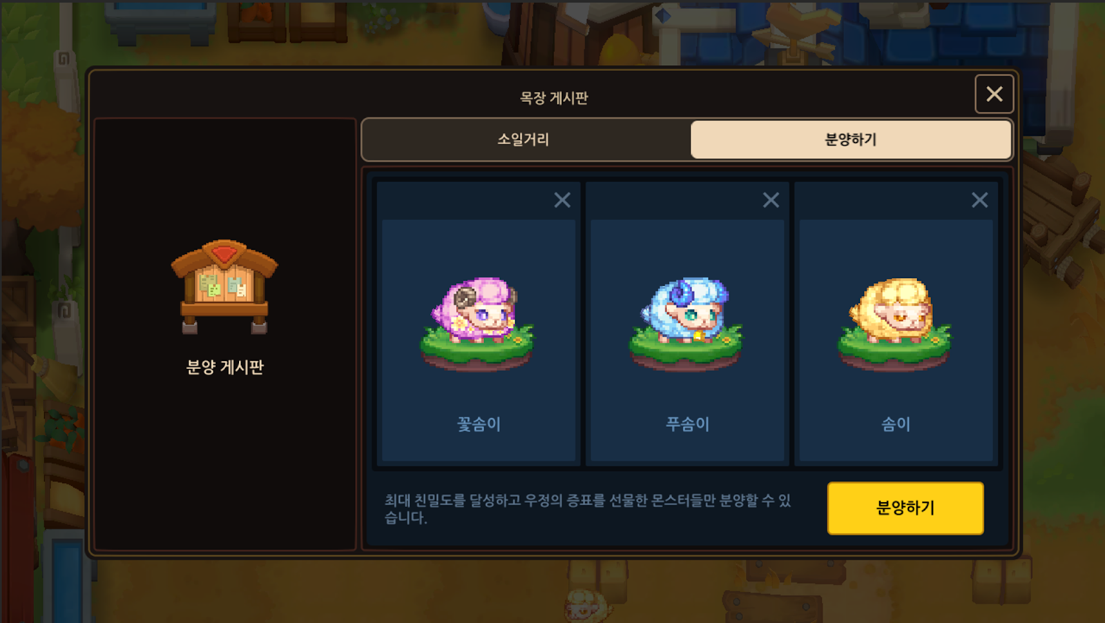 - 목장 게시판에 '분양하기' 탭이 추가됩니다.